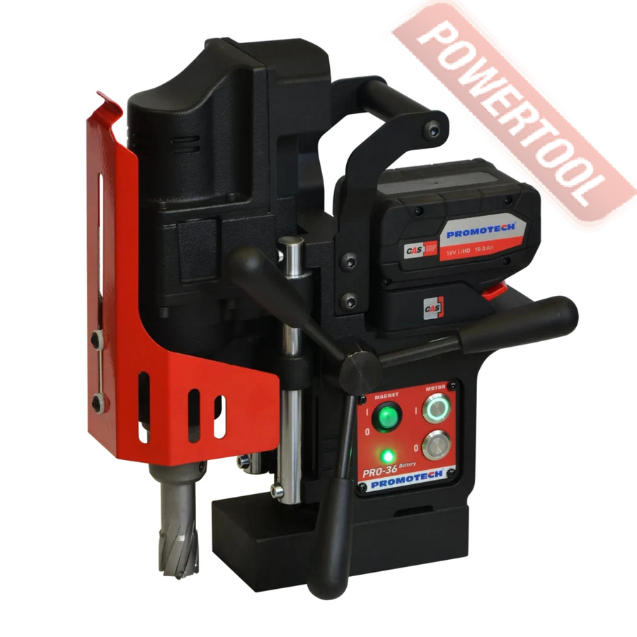 Аккумуляторная магнитная дрель PROMOTECH PRO-36 Battery идеально подходит для использования в местах с ограниченным доступом к электросети. PRO-36 Battery предназначен для сверления отверстий диаметром до 36 мм с помощью кольцевых фрез и сверления отверстий диаметром до 12 мм с помощью спиральных сверл.