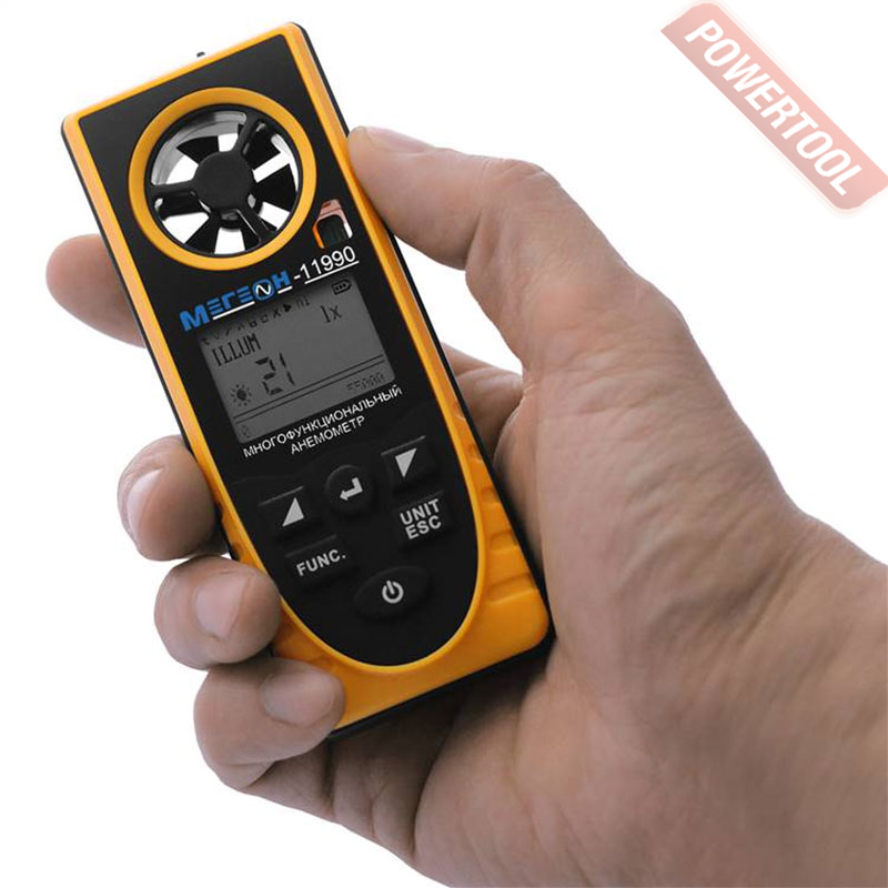 Анемометр многофункциональный портативный МЕГЕОН 11990 - представляет собой портативный многофункциональный инструмент сочетающий в себе функции нескольких приборов. Он подходит для измерения относительной влажности, показателей температуры, уровня освещенности, точки росы, скоростных параметров ветра, атмосферного давления, коэффициента охлаждения ветра, а также позволяет определить высоту над уровнем моря. Наличие интегрированной памяти дает пользователю возможность сохранять результаты измерений, как в ручном, так и в автоматическом режиме.
