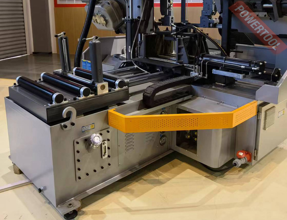 На автоматических станках возможна работа как в ручном режиме, когда каждая операция выполняется вручную посредством нажатия соответствующей кнопки, так и в автоматическом режиме, когда станок выполняет весь цикл резания (зажим заготовки – подвод заготовки – запуск пилы – опускание рамы – остановка пилы – подъем рамы – отжим тисков). В последнем случае оператор должен лишь обеспечить подачу заготовок и нажатие кнопки «Пуск». Станок оснащен гидравлическими тисками. На основной панели расположены: цветной сенсорный дисплей, с помощью которого можно задать программу и отслеживать процесс пиления, регулятор скорости опускания пилы и кнопка аварийного останова.
