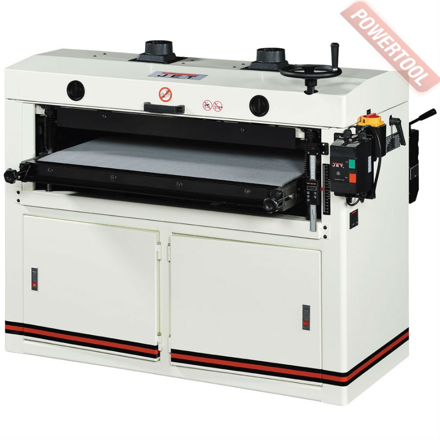 Барабанный шлифовальный станок JET DDS-237 - мощный профессиональный шлифовальный станок, предназначенный для эксплуатации на производстве. При условии небольшого съёма материала подходит для калибрования изделий из дерева, клееных пустотелых фасадов, деталей из МДФ и прочих подобных, причем их сразу же можно будет оклеивать пленкой без дополнительной шлифовки. Конструкция с двумя валами позволяет использовать абразивы с разной зернистостью, то есть за один проход производить грубую и финишную шлифовку. Для достижения наилучшего результата предусмотрена точная регулировка положения выходного вала относительно приёмного, высоту которого подбирают в зависимости от зернистости абразива. Регулировка по высоте шлифовки производится независимо за счет опускания транспортёрного стола. Он размещен на четырёх опорах и регулируется с точностью до 0,2 мм по всей ширине. На практике, разброс толщины после шлифовки на хорошо настроенном DDS-237 значительно меньше. При такой точности станки способны снимать за один проход до 1,5 мм по всей ширине, необходимо лишь правильно подобрать абразив и скорость подачи (2 или 3 м/мин). Основным фактором успешной и безотказной эксплуатации этих моделей является мощный пылеотвод и правильный подбор шлифовальных лент.