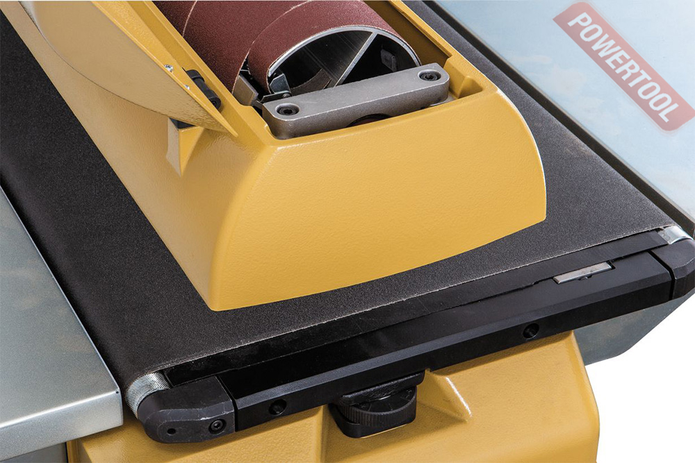 Для регулировки высоты положения шлифовального барабана предусмотрен массивный маховик с полированной поверхностью. Положение можно контролировать по привычной шкале на корпусе, но можно и по цифровому индикатору, так нагляднее и точнее. Он имеет переключатель режима отображения (дюймы/ миллиметры) и кнопку сброса для установки нулевого положения, что удобно как при смене толщины заготовок, так и при переходе к другой зернистости абразива. В качестве последнего используется лента шлифовальной бумаги, намотанная на алюминиевый барабан. Ее концы фиксируются в специальных зажимах, обеспечивающих простоту фиксации и автоматическое натяжение.