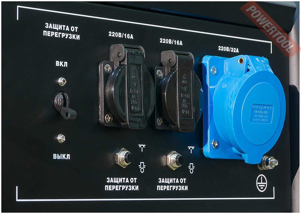- Панель управления станции оснащена тремя пыле/влагозащищенными розетками: 2х220В/16А и 1х220В/32А для подключения мощных потребителей.