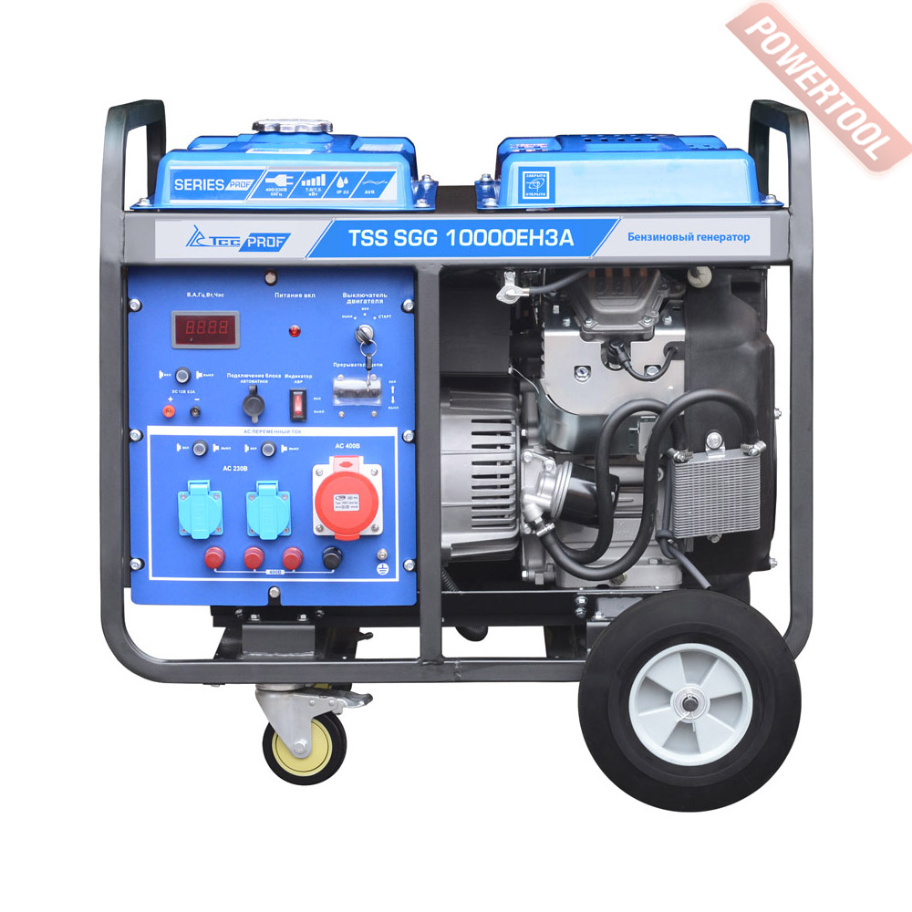 Бензиновый генератор ТСС TSS SGG 10000EH3A с электростартом и с разъемом для подключения блока автоматики трехфазный 10 квт TSS SGG 10000 EН3A предназначен для выработки электроэнергии с основными характеристиками: напряжение 220-380 вольт, частота 50 Гц и номинальной мощностью 10 кВт, оснащенный колесным комплектом, для удобства передвижения. Трехфазный бензиновый генератор с мощностью 11 кВт не только отлично справится с созданием резервного электропитания в случаях отключения электроэнергии, но и гарантирует стабильную работу в качестве главного источника питания, при условии необходимости подключения трехфазных 380 В потребителей. Трехфазный бензогенератор может применяться в автосервисе, строительстве, аварийными службами, а так же на предприятиях малого бизнеса, для подключения бытовых приборов или строительного инструмента. К примеру, в автосервисе можно подключить трехфазный компрессор для работы автоподъемников, в моменты отключения электроэнергии.