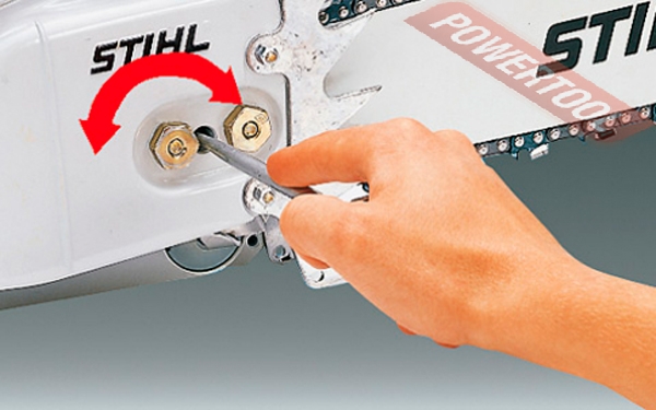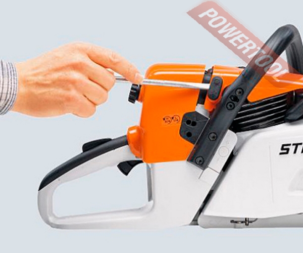 • Боковое устройство натяжения цепи. Доступ к натяжному винту обеспечивается сбоку через крышку цепной звёздочки. Это предотвращает контакт рук с острой цепью и кончиками зубчатого упора