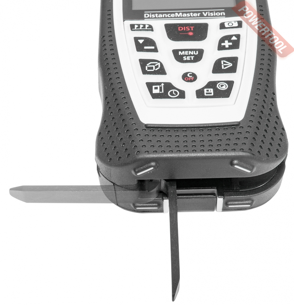 - Четыре точки отсчета. Расстояние может измеряться от передней или задней кромки корпуса дальномера, от точки крепления прибора к штативу и с конца откидной скобы, которая позволяет проводить замеры от внутренних щелей, углов или краев.