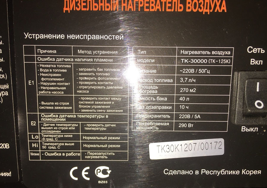 • Топливный бак с индикатором уровня топлива. Датчик уровня топлива предназначен для своевременной заправки агрегата. Объем топливного бака составляет 40 литров. Для достижения максимальной производительности нагревателя настоятельно рекомендуется использовать керосин в качестве топлива. В керосине практически отсутствуют загрязняющие вещества, такие как сера, которая выделяет очень неприятный запах при горении. При отсутствии керосина, в качестве топлива можно использовать легкое дизельное топливо (ДТ для легковых автомобилей по ГОСТ 305-82). При этом нужно учитывать, что дизельное топливо сгорает не так чисто как керосин и выделяет при сгорании гораздо больше вредных веществ, поэтому, необходимо обеспечить больший приток свежего воздуха при работе нагревателя.