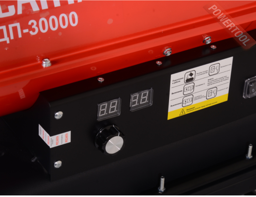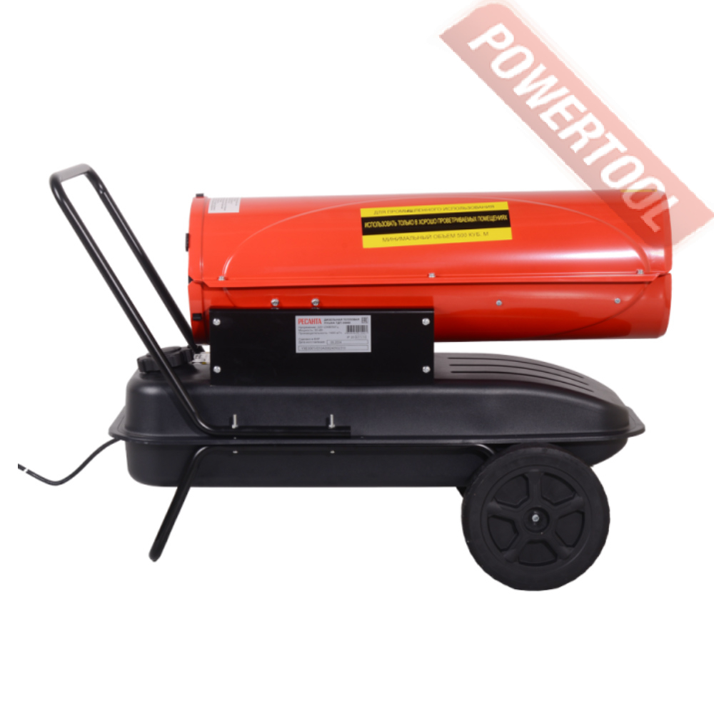 Дизельная тепловая пушка прямого нагрева РЕСАНТА ТДП-30000 может применяться на открытых или хорошо проветриваемых объектах, например, на строительных площадках, заводах, в складских помещениях. Предназначена для высокопроизводительного обогрева нежилых помещений, прогрева бетона или грунта при строительных и ремонтных работах. За короткое время может, обеспечить теплом большое пространство. Открытая камера сгорания выбрасывает вредные продукты вместе с горячим воздухом, поэтому применять в закрытых помещениях с людьми её нельзя. Перемещение и ввод в эксплуатацию не требует особых усилий и знаний. Запуск осуществляется нажатием одной кнопки, после продува системы происходит поджиг и дизельное топливо начинает равномерно сгорать в камере, а вентилятор создает воздушный поток и выдувает теплые массы в окружающее пространство. Уже на первой минуте работы жидкотопливного нагревателя, ощущается высокий КПД системы. Установка этой машины должна происходить в помещениях с возможностью проветривания, давая тем самым выход продуктам сгорания. Так как в технологии изготовления применен процесс прямого нагрева, то вместе с прогретым воздухом из сопла выходят элементы горения. Если нагнетательное давление сбалансировано и форсунка настроена правильно, то выхлопов минимальное количество, копать и темный дым отсутствуют.