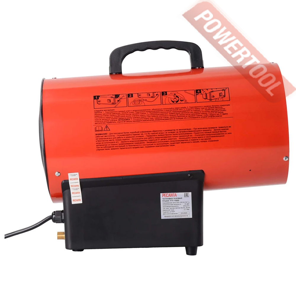 Газовая тепловая пушка РЕСАНТА ТГП-15000 - переносной обогреватель воздуха, работающий на газе, он быстро и эффективно обогревает большие площади. Это оборудование не требует больших затрат и капиталовложений. Газовые нагреватели воздуха широко применяются в помещениях с хорошей вентиляцией: на строительных площадках, заводах и в складских помещениях. Характерные особенности это полное использование топлива, а также обмен тепла благодаря непосредственному смешиванию входящего воздуха с продуктами сгорания. Что касается топлива, то для этих целей подходит баллон с пропаном или бутаном. Соответствующий шланг присоединяется через редуктор к вентилю баллона. Необходимо соблюдать все правила работы с газовыми баллонами. Также необходимо помнить, что процесс горения активно поглощает кислород, который жизненно необходим человеку. Поэтому помещения, где устанавливаются тепловые пушки, должны постоянно проветриваться и иметь хорошую вентиляцию. Для правильной работы обогреватель требует соответствующего количества свежего воздуха. Поэтому он предназначен для использования вне помещений или в помещениях с хорошей вентиляцией, где обеспечено соответствующее количество воздуха. Соответствующую вентиляцию можно обеспечить, приспосабливая обогревательную мощность прибора к площади помещения в соответствии со следующей пропорцией: 1 куб.м на каждые 100 Вт мощности. Ни в коем случае не рекомендуется, чтобы помещение было меньше, чем 100 куб.м. Соответствующий обмен воздуха может быть обеспечен благодаря вентиляционному отверстию, соответствующему следующим требованиям: величина 25 кв.см на 1 кВт обогревательной (минимум 250 кв.см) мощности, размещение точно между верхней и нижней частью помещения.
