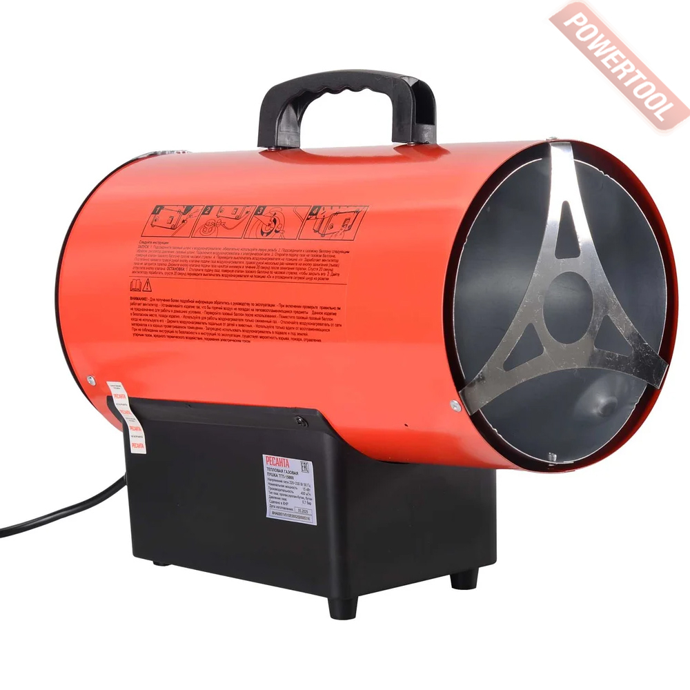 Тепловая газовая пушка, топливо: сжиженный газ (пропан/пропан-бутан/бутан), напряжение сети 220 В, тепловая мощность 15 кВт, расход воздуха 400 куб.м/ч, расход сжиженного газа 1,09 кг/ч, режим вентилятора, контроль пламени, датчик перегрева, пьезоэлектрический поджиг, габариты 520х220х340 мм, вес 5,82 кг, газовый шланг, редуктор.