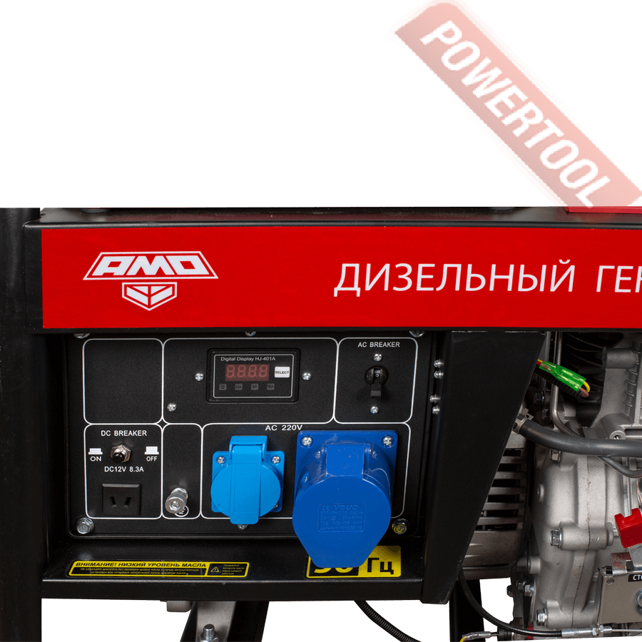 Электростанция дизельная однофазная 220 В, максимальная мощность 5,5 кВт, номинальный ток 20,5 А, 4-тактный дизельный двигатель 186FA объемом 418 куб.см и мощностью 8,57 л.с. топливный бак 12,5 л, расход топлива 1,1 л/ч, емкость картера 1,65 л, 1 розетка 220В/16A, 1 розетка 220В/32A, выход 12 В, время работы без дозаправки топлива 11 ч, автоматическая регулировка напряжения AVR, цифровой дисплей, датчик низкого уровня масла, защита от перегрузки, открытый кожух, размеры 710х495х665 мм, вес 113 кг, колеса, ручка.