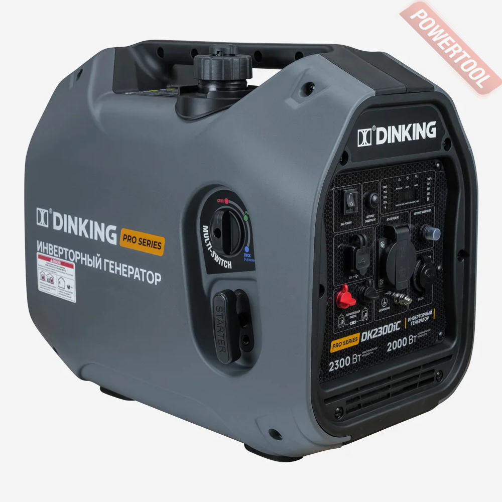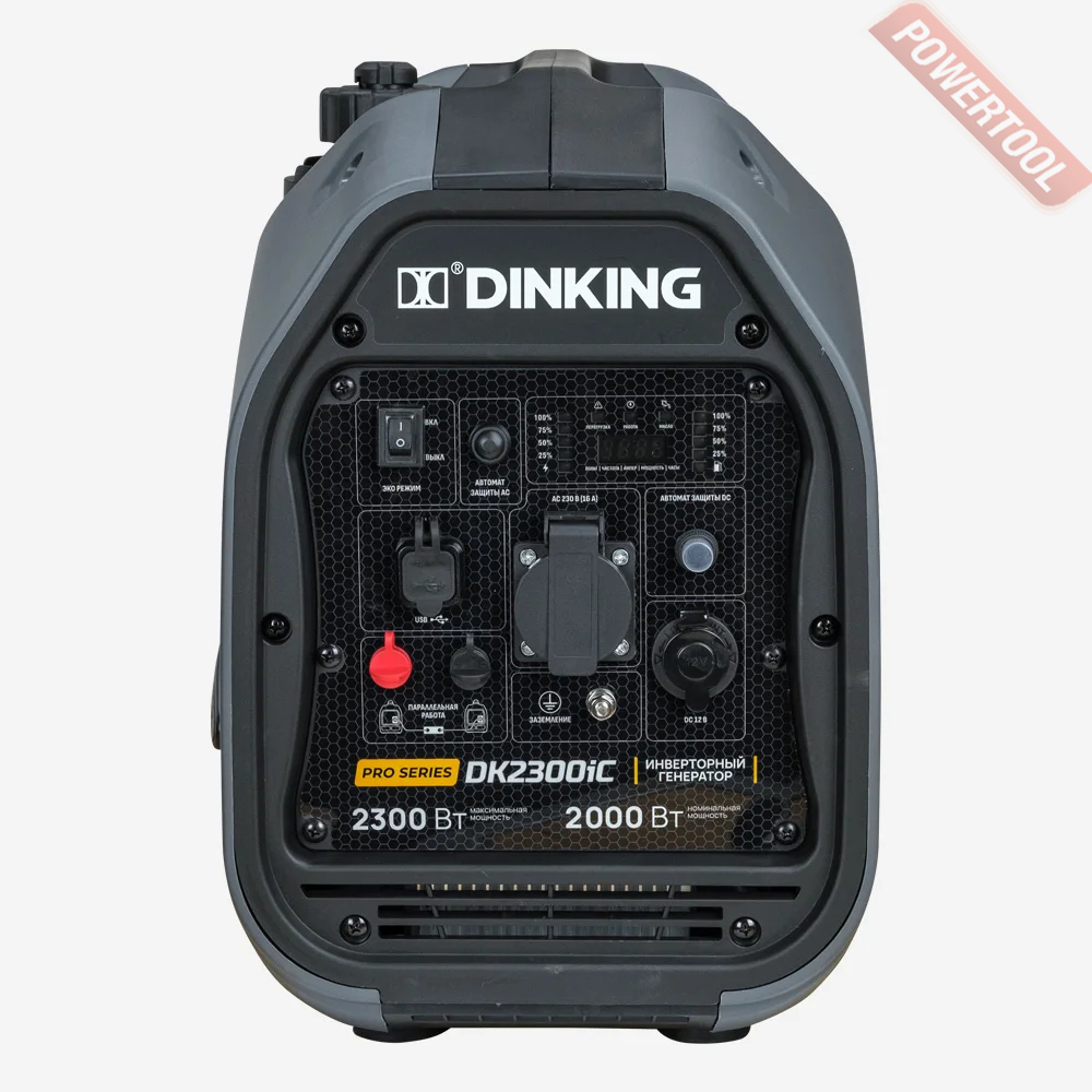 Генератор инверторный DINKING DK2300iC Это удобный, малошумный, портативный и экономичный источник питания с максимальной мощностью 2300 Ватт. Уровень шума при работе инверторного генератора гораздо ниже обычных бензогенераторов, а его компактность позволяет его перевозить даже в обычной легковой машине, он идеально подходит для кемпингов и частных домов, где есть необходимость дополнительного комфорта.