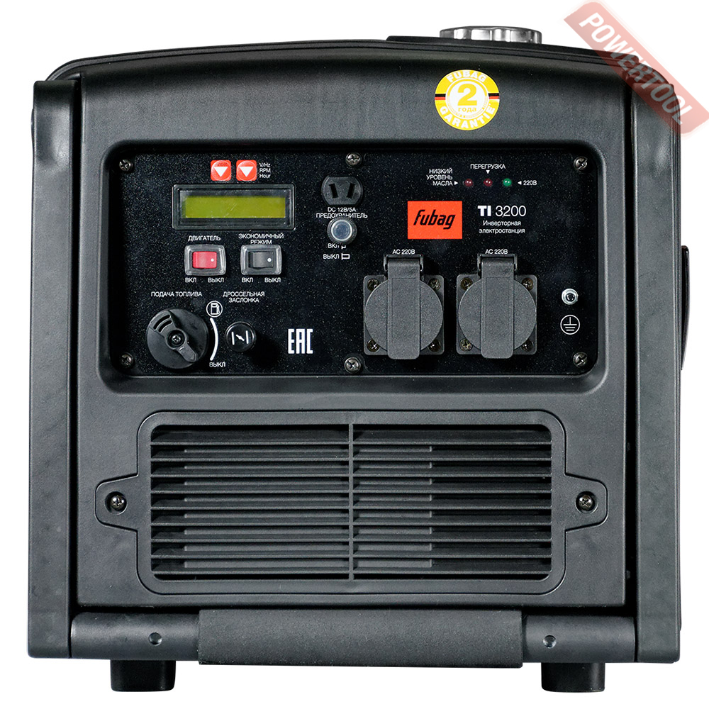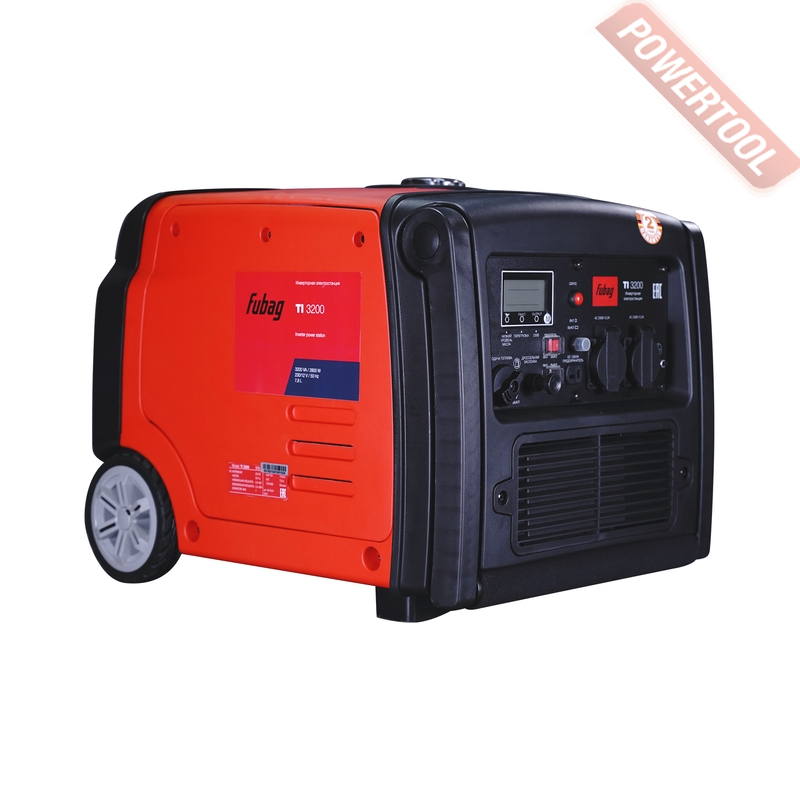 Генератор инверторный FUBAG TI 3200 номинальной мощностью 2,8 кВт дающий на выходе чистый ток. Инверторные цифровые электростанции FUBAG рекомендованы к использованию в качестве аварийного источника электропитания дачи или загородного дома. Идеально подходит для проведения строительных, ремонтных и монтажных работ. Обеспечивают идеальное качество тока, дают возможность подключения напрямую (без стабилизатора) электронных устройств. Благодаря возможности вырабатывать постоянный ток 12 В могут быть использованы для зарядки аккумуляторных батарей, электропитания портативных радиостанций, автомобильных компрессоров и т.д. Они умеют переходить в экономичный режим, показывают пределы максимальной нагрузки с помощью специального индикатора. Автономные цифровые инверторные электростанции FUBAG сочетают в себе все преимущества синхронных и асинхронных генераторов. Качество тока, получаемого на выходе из инверторной электростанции FUBAG, значительно превосходит качество тока, получаемого от традиционной электростанции. За счет чистого тока, идеальной синусоиды выходного напряжения (хорошей помехоустойчивости) и наличия электронной регулировки инверторные станции FUBAG идеально подходят для питания электронного оборудования.