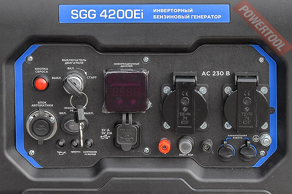 - Индикаторы на панели показывают параметры напряжения, превышение мощности генератора, низкий уровень масла.