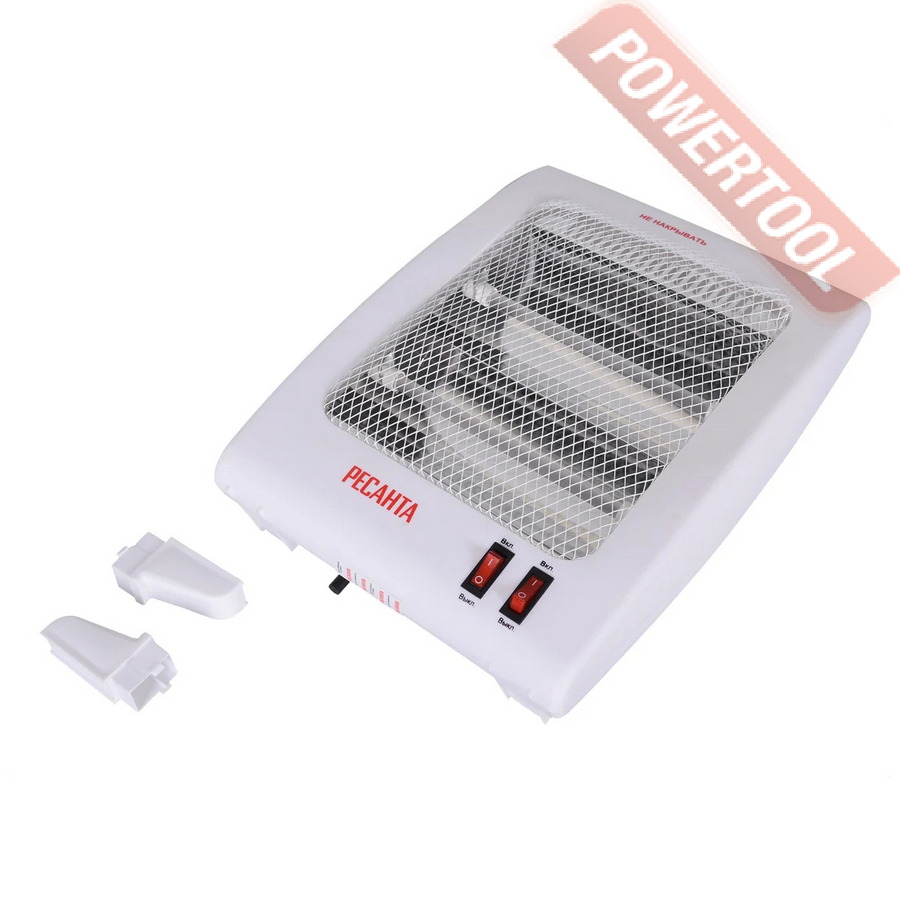 Обогреватель представляет собой пластиковый белый корпус, в котором в качестве нагревательных элементов установлены две кварцевые лампы. Каждая из них включается отдельной кнопкой на передней стороне корпуса, таким образом обогреватель работает в 2 режимах – 400 и 800 Вт. Для устойчивого положения на ровной поверхности модель снабжена съемными ножками-упорами. На задней части корпуса предусмотрена выемка для переноски прибора в руке.
