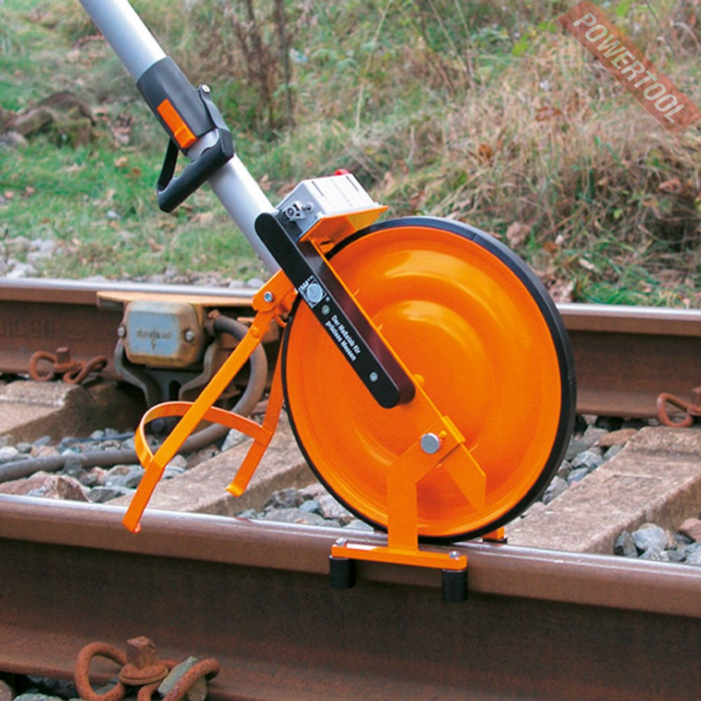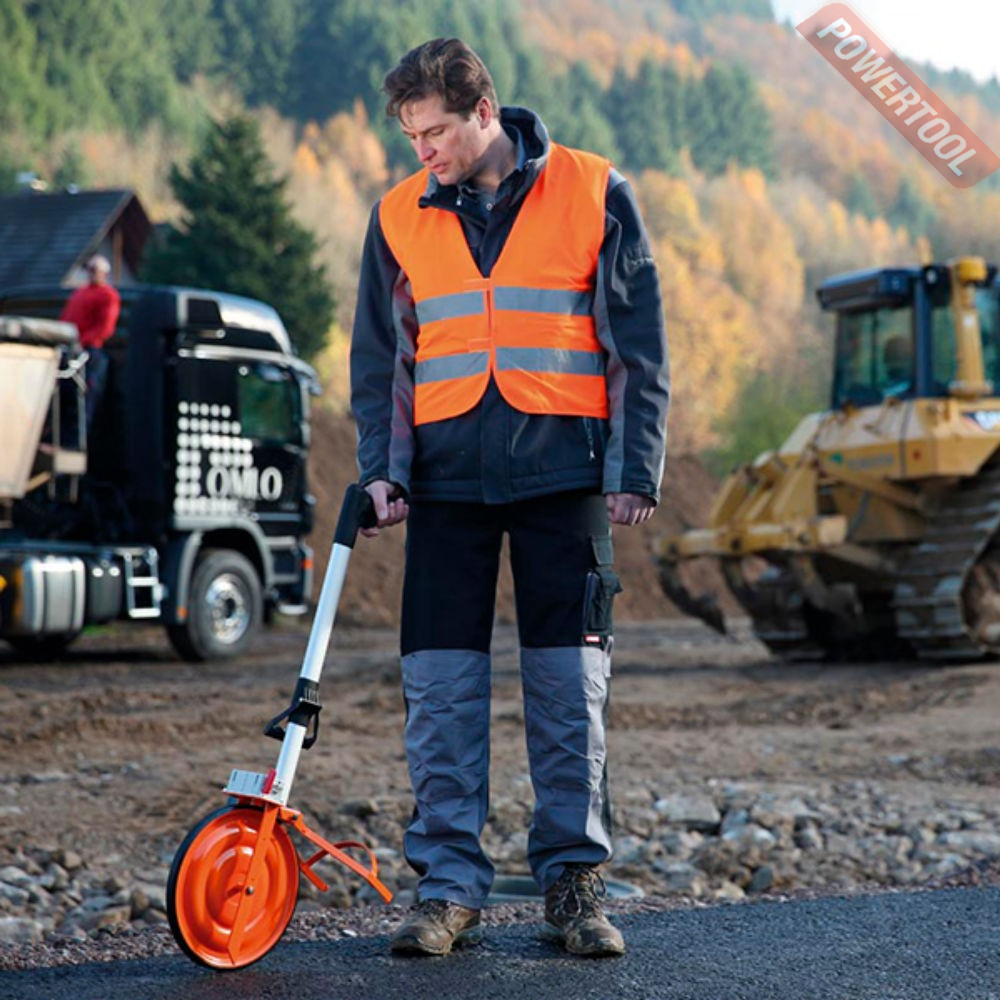 Измерительное дорожное колесо, монолитная конструкция колеса, диаметр колеса 30 см, длина окружности 100 см, мах расстояние 9999,9 м, счетчик действует в обоих направлениях движения вперед и назад, складная рукоятка с встроенной кнопкой тормоза обеспечивает простое и удобное обращение, опорная подставка, вес 5 кг.