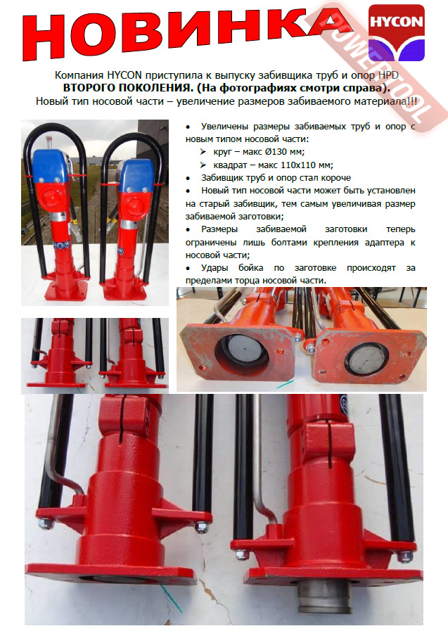 Копер гидравлический для забивки столбов HYCON HPD - ручной гидравлический инстумент, для забивки в грунт труб, опор для ограждений, заборов или дорожных знаков, на глубину до 3 метров. Области применения: установка ограждений, опор для заборов, дорожных знаков, установка тентов и прочее. При комплектации забивщика делителем потока Hycon возможно питание от строительной техники (экскаватора, трактора или погрузчика) с техническими характеристиками не превышающими показатели давления 240 бар и потока 80 л/мин.