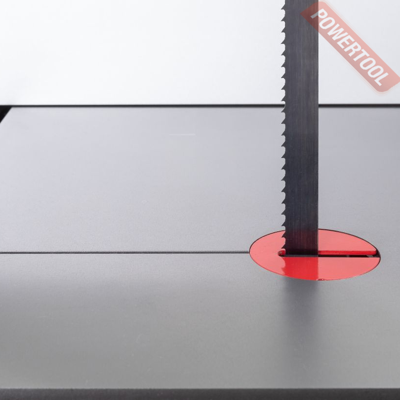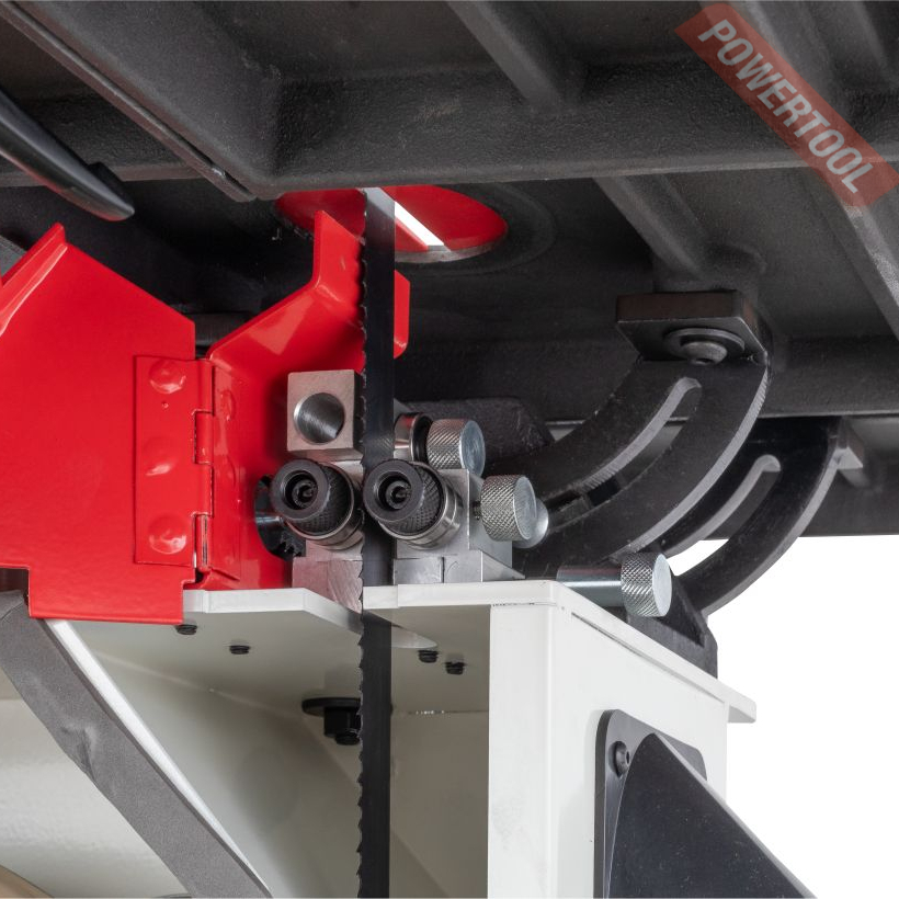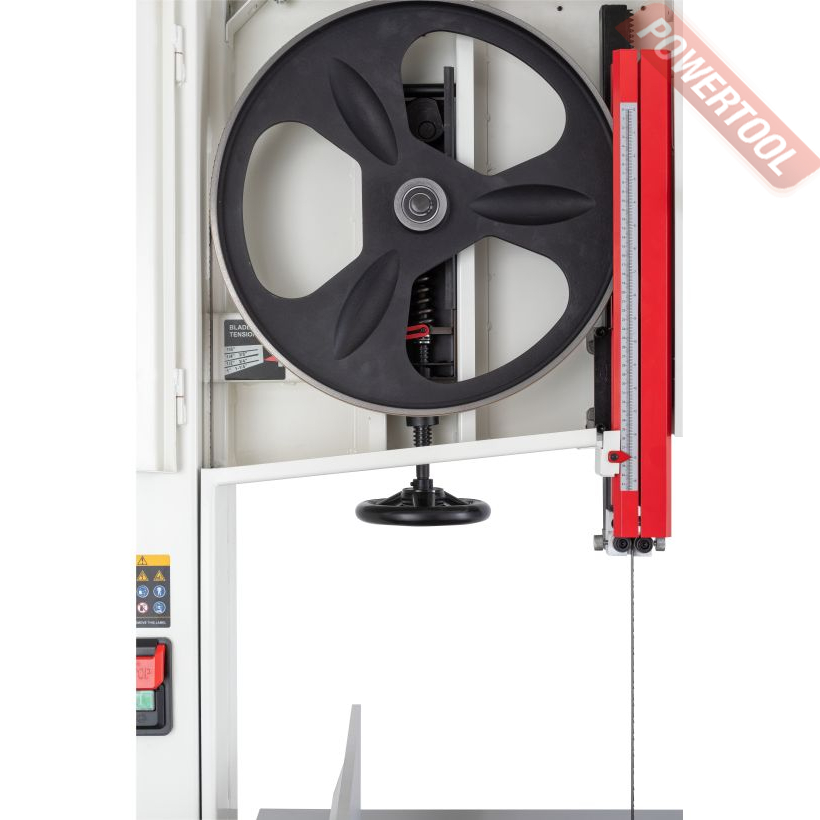 Натяжение ленты на колесах одним движением рычага. Большая ширина шкивов дает возможность установки широких пильных лент. Направление ленты при пилении двумя группами трехроликовых направляющих на шарикоподшипниках. Одна группа роликов расположена прямо над заготовкой и вторая – под столом. Стрелочный индикатор уровня натяжения поможет выбрать предварительный натяг пильной ленты. Отрегулировать натяжение до требуемого можно при помощи маховика на корпусе пилы под верхним/ведущим шкивом. Через смотровое окно необходимо проследить при первичной установке за сбеганием ленты. Лента должна находиться по центру и сбегание ее в любую из сторон недопустимо. Плавность хода и пиление без вибраций обеспечат чугунные шкивы с массивным телом. Они отбалансированы на заводе-изготовителе с использованием стендов компьютерной балансировки.