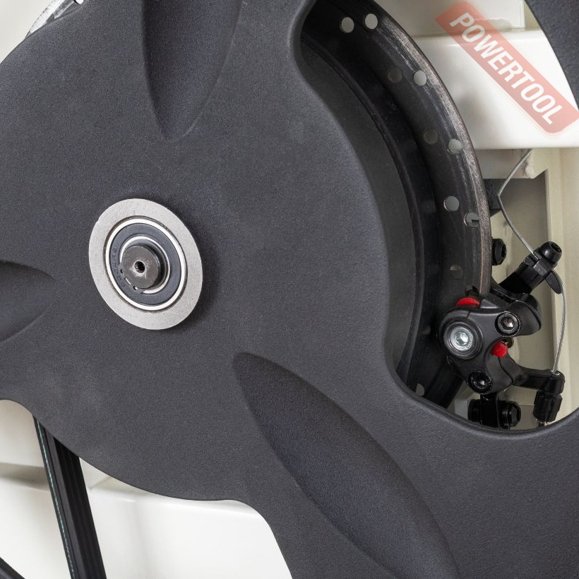 JWBS-18SFX оснащена особенной системы безопасной остановки пиления в экстренной ситуации. Эта система включает тормозной диск увеличенного диаметра, тормозной суппорт, педаль тормоза, трос-механизм торможения и концевой переключатель. Одновременно с нажатием педали-тормоза, срабатывает отключения электрической части двигателя через концевой переключатель и мгновенно останавливает подачу электричества двигателю. Одновременно с этим, колодки тормозят диск и соответственно колесо привода пильной ленты.