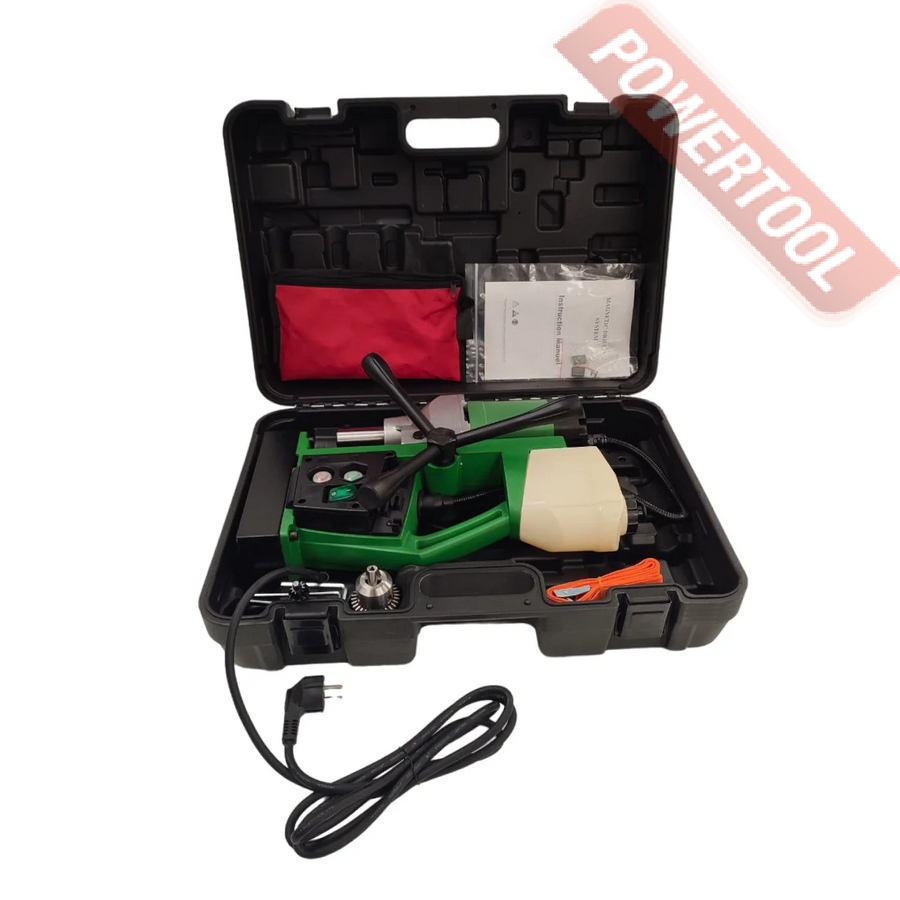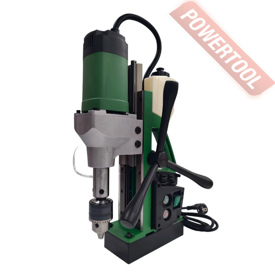 Магнитный сверлильный станок, 1100 Вт, 220 В, max диаметр корончатого сверла 35 мм, max диаметр спирального сверла 16 мм, крепление корончатого сверла на Weldon 19, ход шпинделя 210 мм, частота вращения шпинделя 750 об/мин, 1 скорость, прижимная сила 9000 Н, размер магнитного основания ДхШ 200х100 мм, вес 14,7 кг, система подачи СОЖ, в комплекте патрон Weldon 19/трехкулачковый 3-16, емкость для СОЖ, рукоятка 3 шт, шестигранный ключ, комплект угольных щеток, страховочный ремень, клин, сумка для хранения оснастки, кейс.
