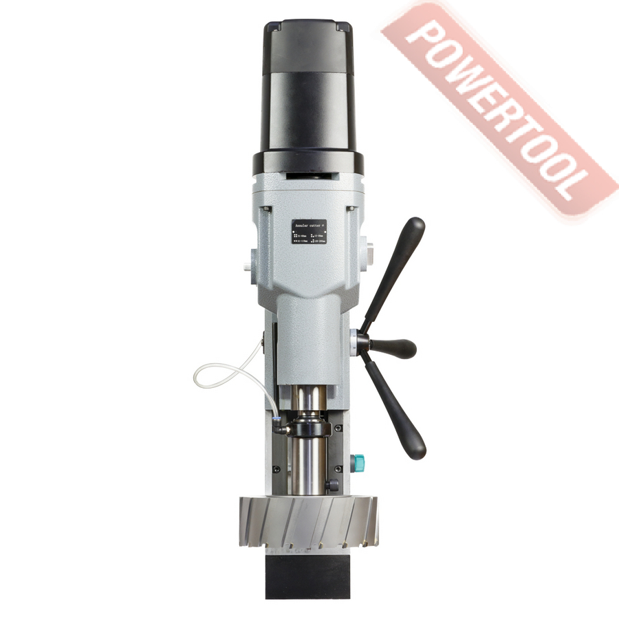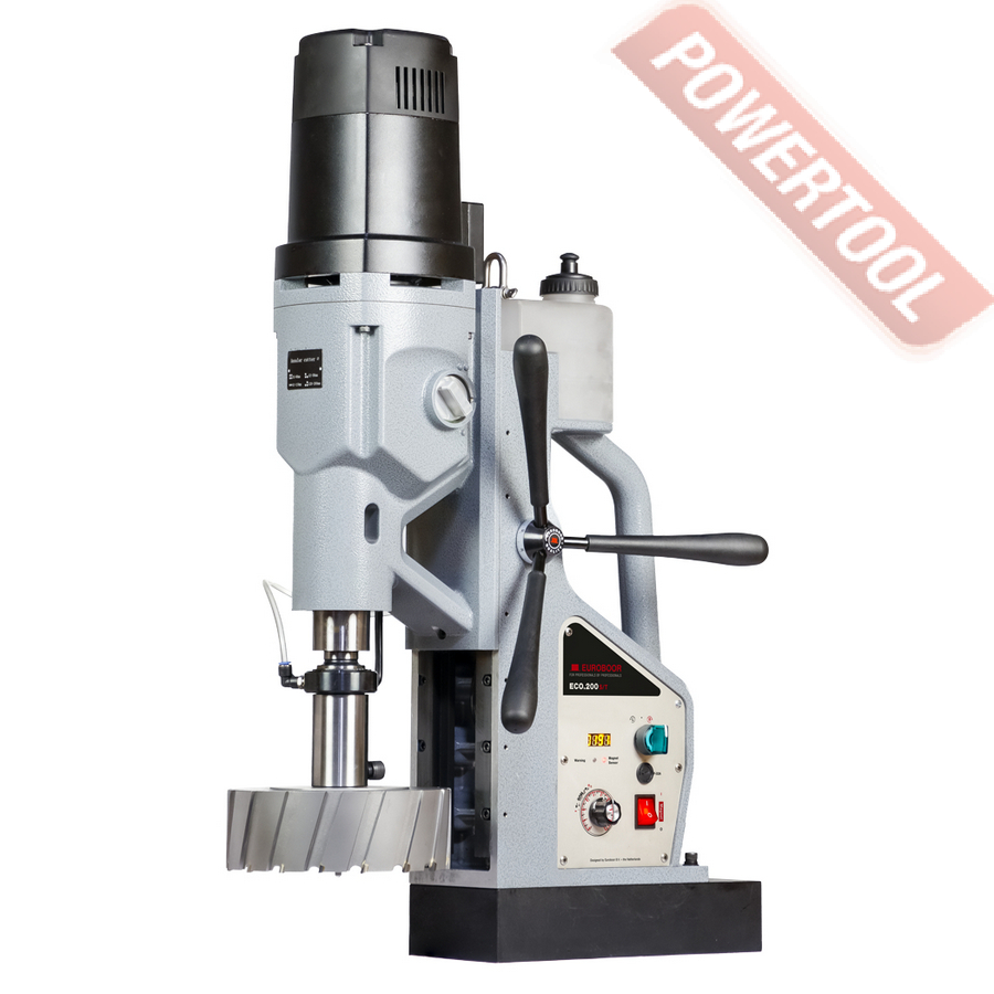 Магнитный сверлильный станок EUROBOOR ECO.200S/T – надежный и производительный магнитный станок для корончатого сверления отверстий диаметром 12 – 200 мм, а также спирального сверления отверстий диаметром 1 – 50 мм, зенкования отверстий 10 – 205 мм и нарезания резьбы М3 – М48. Оснащен двигателем мощностью 3,6 кВт, 220 В. Регулируемая скорость с широким диапазоном частоты вращения в 4 режимах от 40 до 470 об/мин с реверсом. Магнит с прижимной силой 3680 кг надежно фиксируется на металлических поверхностях. Встроенный бак для охлаждающей смазки инструмента продлевает его ресурс. Зажим инструмента КМ4, зажим для сверла Weldon32. Вес 58,5 кг обеспечивает устойчивость при работе.