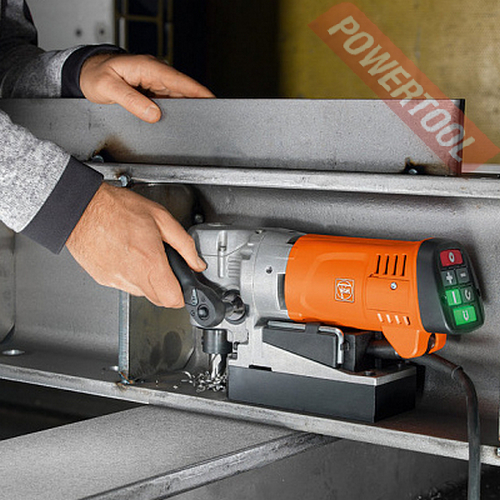 Магнитный сверлильный станок FEIN KBC 35 - односкоростной магнитный станок с угловым редуктором для сверления корончатым сверлом по металлу диаметром до 35 мм и спиральным до 16 мм. Хвостовик 3/4 Weldon (19 мм). Максимальный диаметр зенковки 32 мм. Нарезание резьбы до М12. Специально создан для работы в узких и труднодоступных местах. Монтажная высота станка всего 169 мм. Скорость вращения под нагрузкой 130-520 об/мин, с функцией запоминания частоты вращения. Электронный тахометр гарантирует стабильную частоту вращения в правом и левом направлении. Подача СОЖ в зону сверления с помощью ручного насоса. Величина хода каретки 46 мм. Прилагаемая трещотка позволяет управлять сверлением с двух сторон.