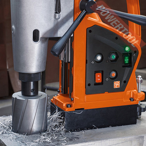 Магнитный сверлильный станок FEIN KBU 110-4 M - четырехскоростной мощный универсальный магнитный станок для сверления корончатым сверлом по металлу диаметром до 110 мм и спиральным до 40 мм. Максимальный диаметр зенковки 60 мм. Нарезание резьбы до М36. Контроль силы магнита с помощью удобного визуального индикатора. Хвостовик Weldon 32. Механический редуктор обеспечивает четырехскоростное реверсивное вращение шпинделя при выполнении любых сверлильных работ и нарезания резьбы. Величина хода каретки 280 мм (полный диапазон хода 400 мм). Зажим инструмента через MK 4 (конус Морзе). Автоматическая подача жидкости в зону сверления от встроенного бачка для СОЖ. Проскальзывающая муфта-ограничитель надежно защищает двигатель при заклинивании сверла. Уверенная работа даже в жестких условиях.