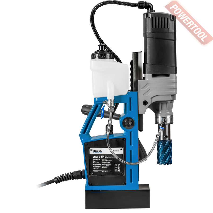 Магнитный сверлильный станок HEDEN DM-36K выполняет сверление корончатыми сверлами диаметром до 36 мм и спиральными сверлами диаметром до 13 мм. Направляющие типа двойной ласточкин хвост позволяют перемещать и закреплять привод в любом положении. Благодаря этому можно работать с длинными спиральными сверлами или сверлить ниже уровня основания станка.