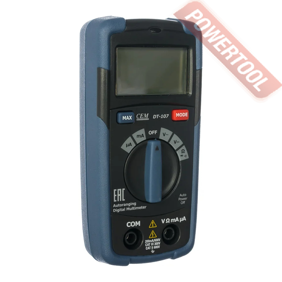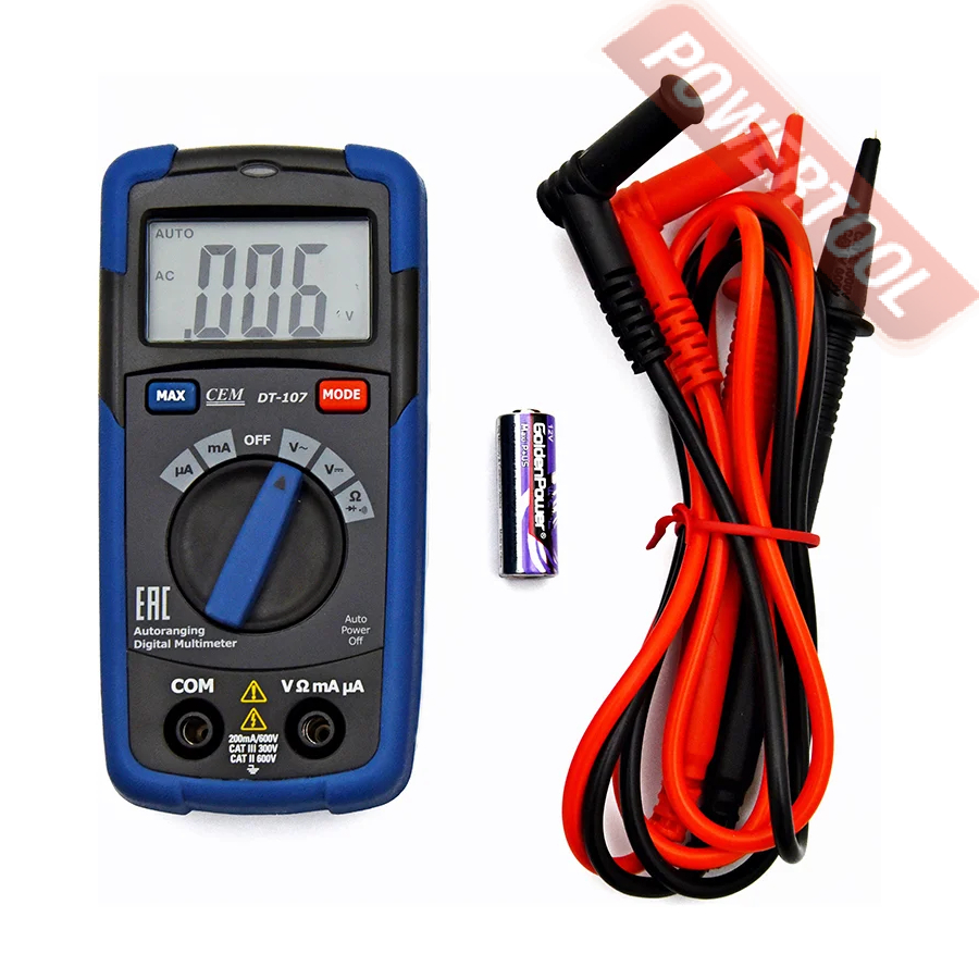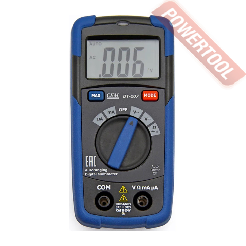 Наиболее востребован CEM DT-107 при выполнении измерений, требующих высокой скорости работы. При использовании данного мультиметра нет необходимости выбирать пределы измерений вручную — это прибор делает автоматически. Данная функция отличает CEM DT-107 от младших моделей серии. Таким образом вы сократите время подготовки к производству замеров и исключите возможность повреждения измерительного контура из-за случайной ошибки при выборе диапазона. Дополнительную защиту от перегрузок обеспечивает внутренний сменный малоинерционный предохранитель.