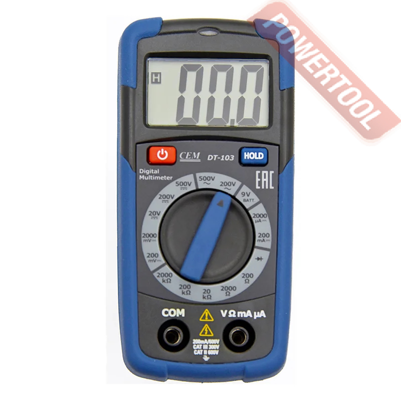 - Точность показаний. CEM DT-103 — бюджетный прибор для ремонтных работ с электросетями. Несмотря на свою цену, функциональность модели подобна более дорогим устройствам. Широкий измерительный диапазон, точность измерения колебаний электросети с погрешностью в 1,5 процента — отличительные черты девайса. В условиях спешной или беспрерывной работы поможет функция HOLD, фиксирующая полученные ранее данные.
