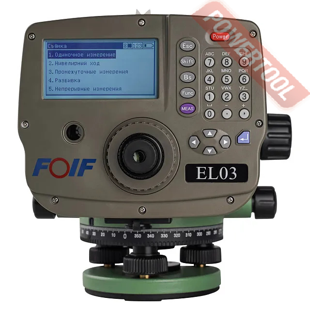 Нивелир цифровой FOIF EL03 – геодезический прибор высокоточного класса, обеспечивающий отличную производительность работ за счет реализации автоматического считывания показаний с нивелирной рейки с кодовой разметкой, с документированием полученных результатов. Внешне не отличаясь от линейки EL300A, он обладает улучшенной точностью при работе с инварной рейкой, большей измерительной дальностью и дополнительно поддерживает режим беспроводного управления по Bluetooth-каналу, что повышает мобильность геодезиста. Устройство способно выполнять разовые и непрерывные замеры, а также позволяет решать задачи по разбивке, переносу высот, выравниванию, дифференциальным измерениям, мониторингу деформаций, развитию нивелирных сетей II и III класса, и т.п.