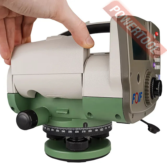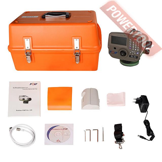 Оснащенный буквенно-цифровой клавиатурой с навигационными клавишами, электронный нивелир FOIF EL03 обладает расширенными возможностями по вводу и редактированию данных через "меню проектов". 30-кратная зрительная система измерителя снабжена 45-миллиметровым объективом с высокой светосилой, для защиты которого от случайных повреждений на корпусе размещен козырек. Продольная верхняя ручка упрощает извлечение изделия из транспортировочного бокса, его переноску в пределах рабочей площадки и установку на штатив. В верхней части оборудования предусмотрен прицельное приспособление, позволяющее предварительно наводить измерительный прибор в направлении точки съемки.