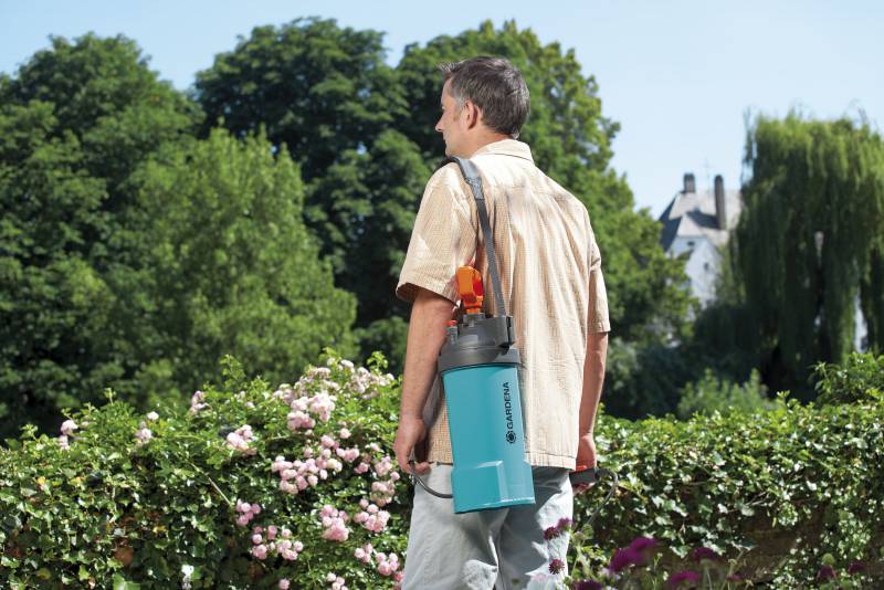 Опрыскиватель помповый ручной GARDENA 000869-20.000.00 - высококачественный опрыскиватель GARDENA Comfort 5 л представляет собой идеальный инструмент для внесения средств защиты растений и удобрений, а также для направленного мягкого полива, например, рассады. Наконечник позволяет полностью регулировать напор: от сильной струи до мелкодисперсного тумана. Практичная широкая горловина облегчает залив и смешивание жидкостей. Опрыскиватель снабжен надежным, сохраняющим форму корпусом, выдерживающим высокое давление, с удобным точным индикатором уровня. Опоры для ног облегчают накачку и гарантируют устойчивость на неровных поверхностях. Опрыскиватель рассчитан на давление 3 бар (максимум) и снабжен предохранительным клапаном для быстрого сброса давления в целях обеспечения безопасной эксплуатации. Специальный наконечник, расположенный под углом, позволяет опрыскивать листья с обратной стороны. Плечевой ремень с мягкой вставкой гарантирует удобство эксплуатации и транспортировки опрыскивателя. Также опрыскиватель снабжен эргономичной D-образной ручкой для удобной эксплуатации и практичным пусковым механизмом с фиксатором положения.