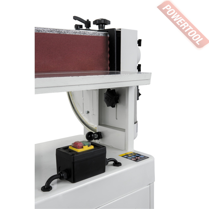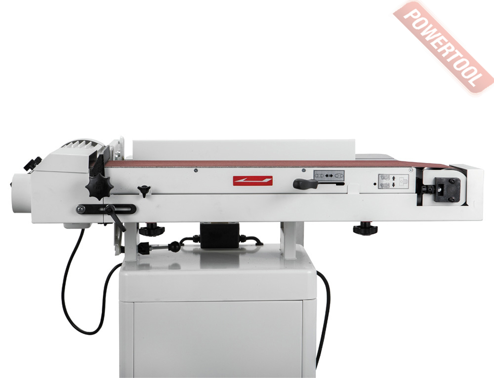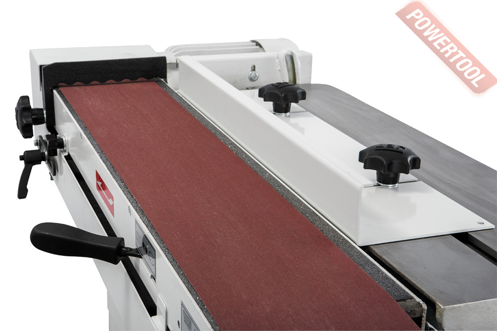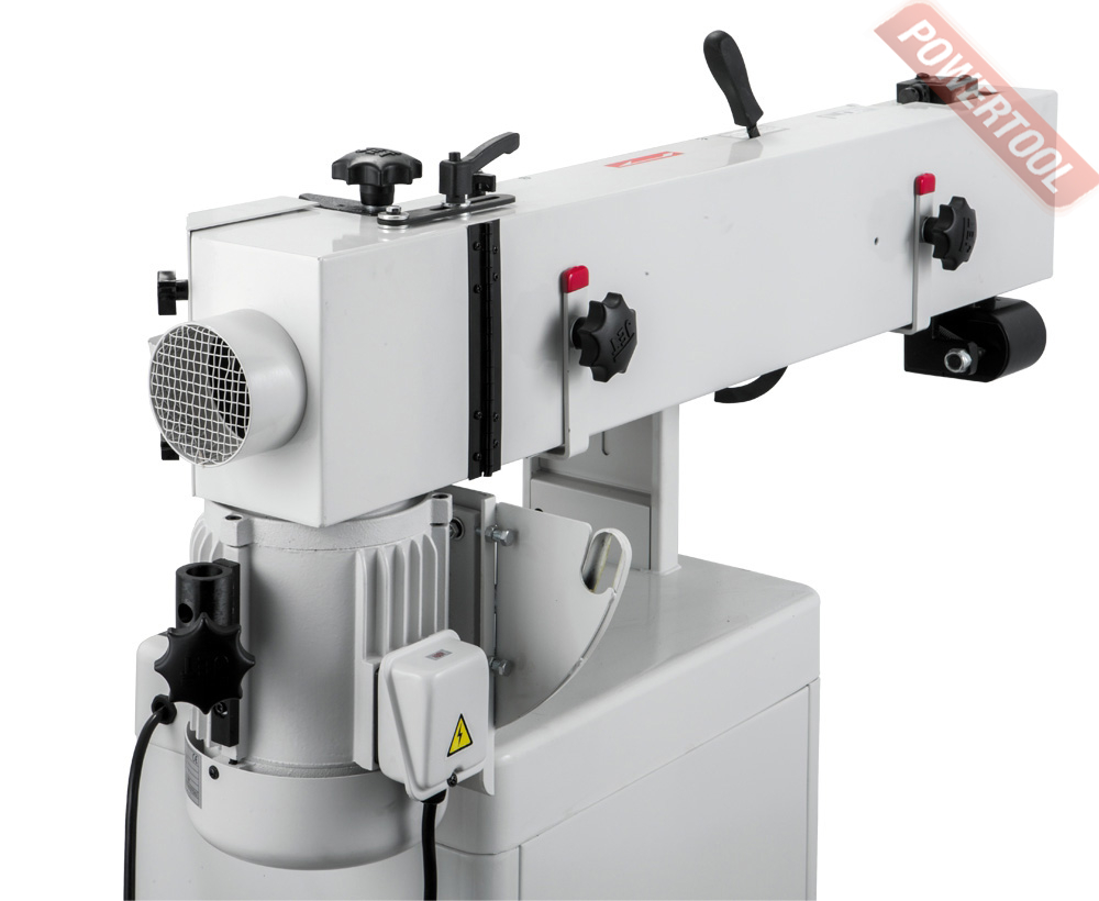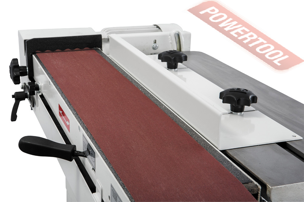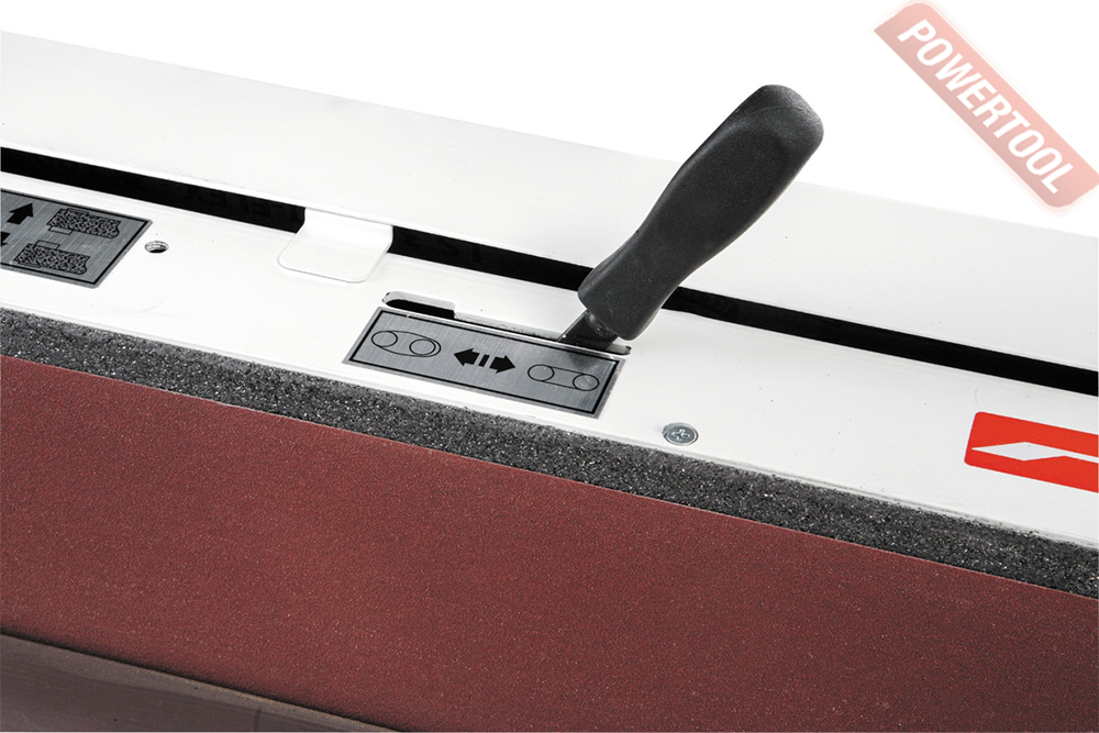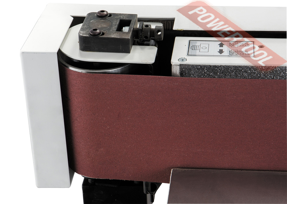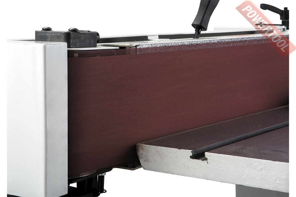 Модель оснащена вспомогательным механизмом, который за счет поворота узла переднего натяжного ролика обеспечивает колебания ленты в направлении перпендикулярном основному движению. Осцилляция способствует более эффективной работе абразива и повышает производительность станка.