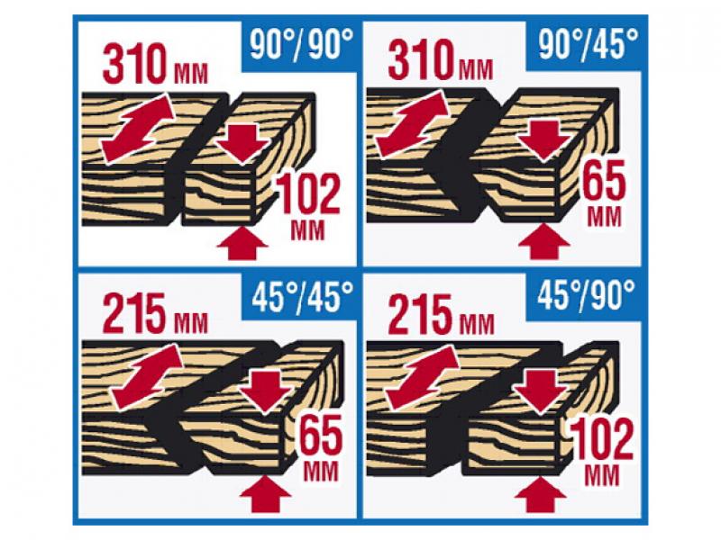 • Наклон пильного диска. Головка пилы наклоняется влево, с дополнительным угловым диапазоном для подреза.