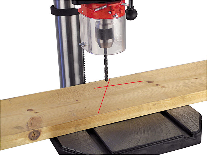 - Лазерный указатель оси сверления. Станок комплектуется лазерным устройством для отображения на поверхности заготовки центра предстоящего отверстия.