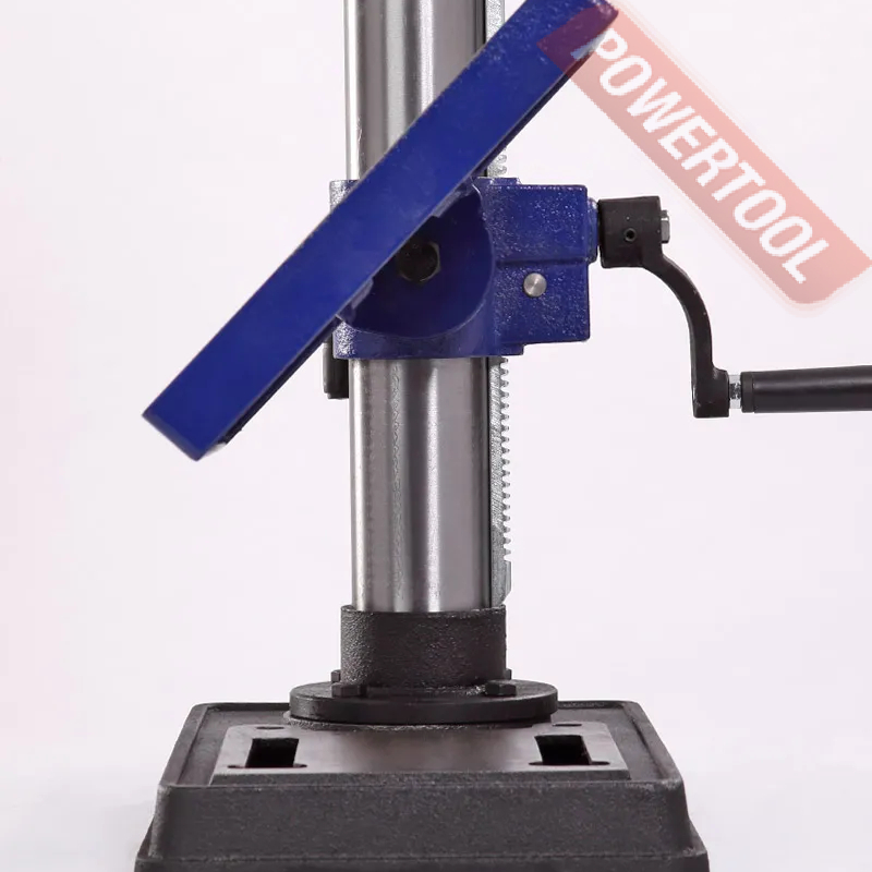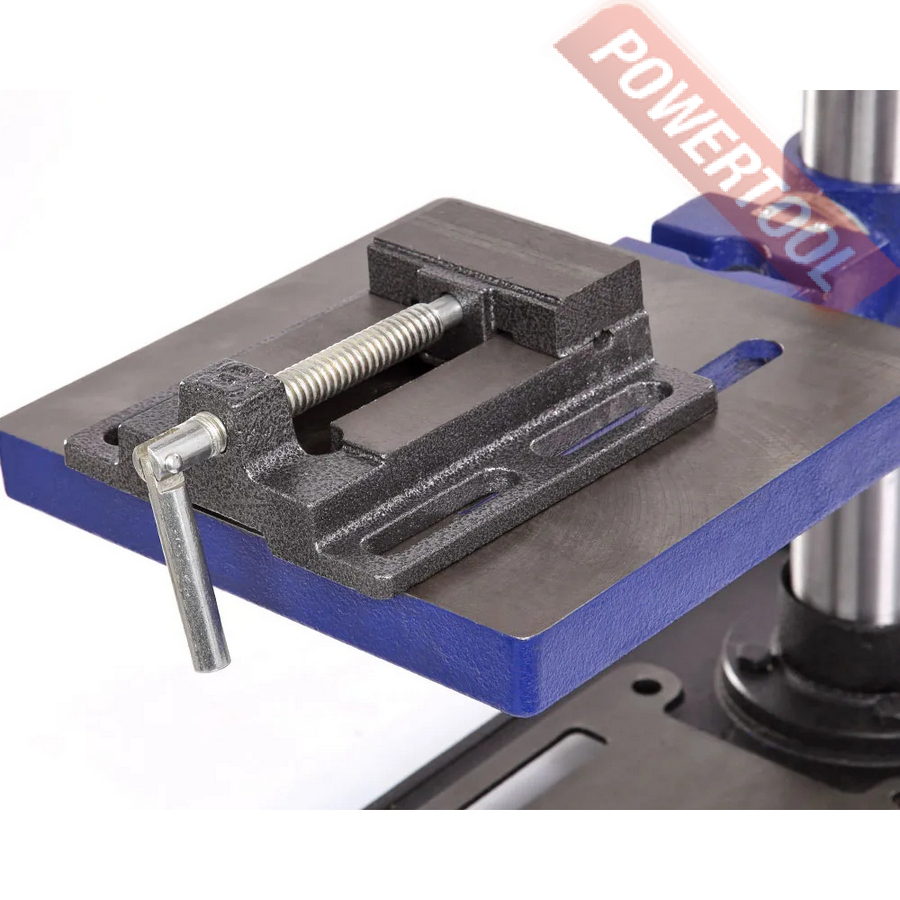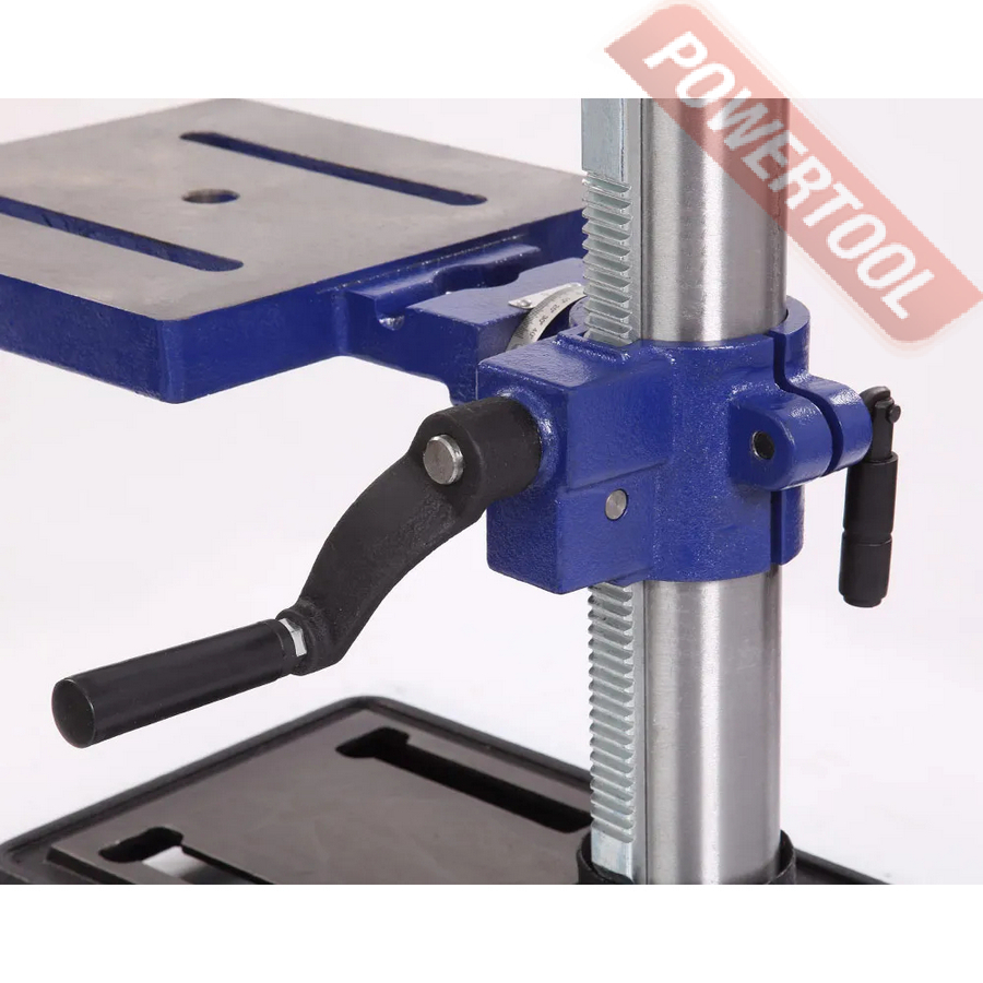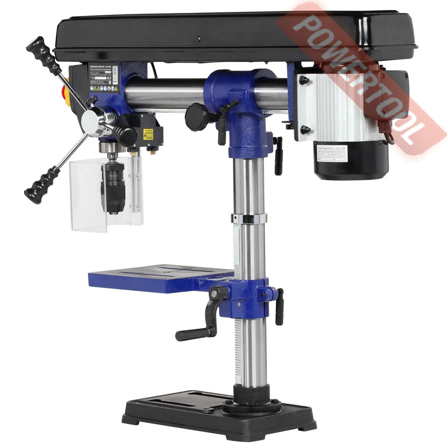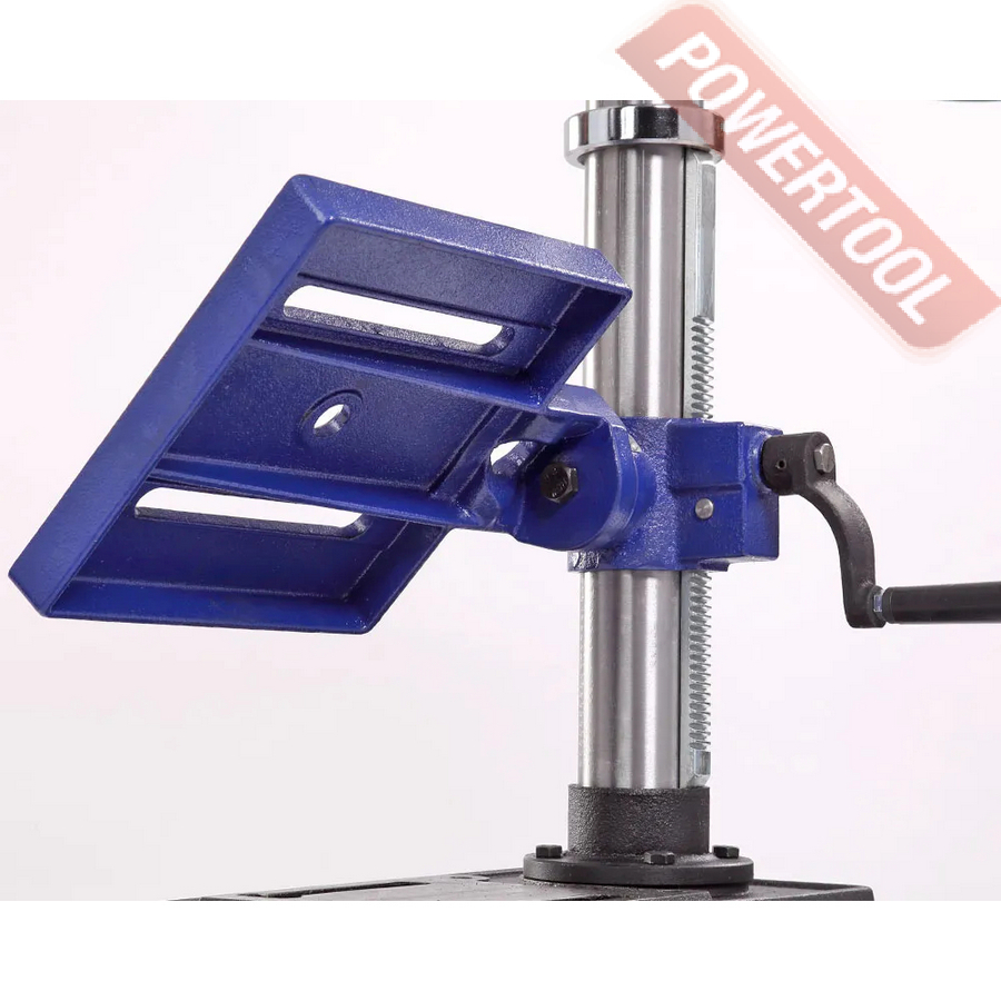 Патрон быстрозажимной с максимальным диаметром зажимаемого хвостовика инструмента 16 мм. Диаметр стойки (колонны) 60 мм, на ней имеется зубчатая рейка, поднятие/опускание стола настраивается с помощью рукоятки.