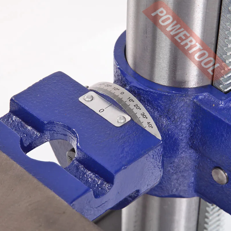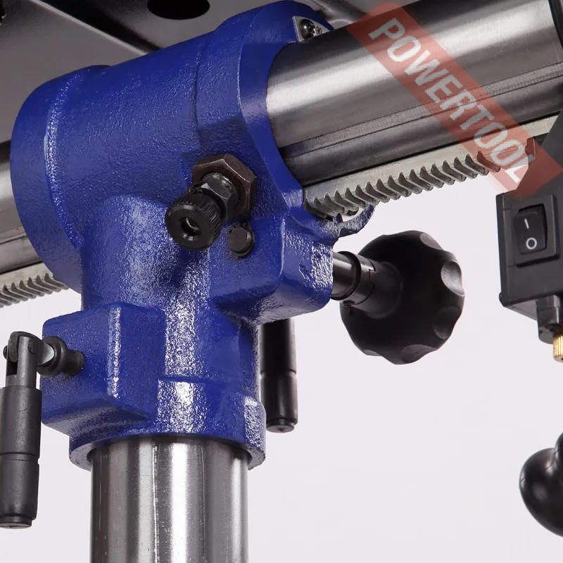 Шкала, расположенная на рукоятке регулировки глубины сверления, показывает ход пиноли шпинделя, с ее помощью можно настраивать нужное значение. Наконечники тройной рукояти удобной формы, что способствует плавной подаче сверла к заготовке.