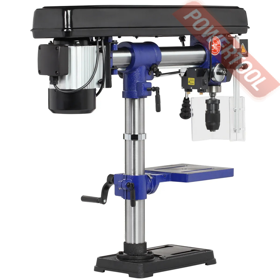 Модель RDP430-16/380 является радиальной, то есть возможны поворот сверлильной головки относительно вертикальной оси (360 град.), наклон относительно горизонтальной оси (45 град. вправо, 90 град. влево) и есть ход по горизонтали. Стол, опора и корпус сверлильной головки выполнены из чугуна. На основании имеется два отверстия для дополнительной фиксации станка.