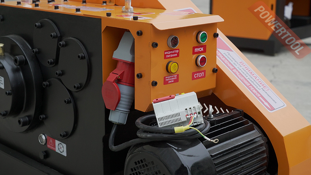 Станок для резки арматуры электрический, 4 кВт, 380 В, диаметр арматуры гладкой/рифленой 6-45 мм/6-40 мм, частота хода ножей 32 реза/мин, габариты ДхШхВ 1450х470х750 мм, вес 534 кг.