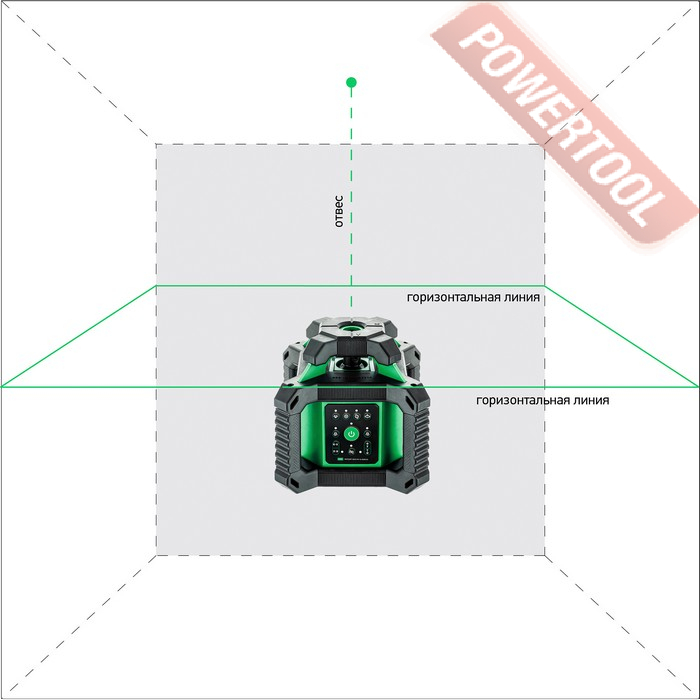Ротационный лазерный нивелир для построения горизонтальной и вертикальной плоскостей, точки зенита, зеленый луч, мах рабочий диапазон 500 м в диаметре, точность нивелирования 0,1 мм/м, скорость вращения 0 / 120 / 300 / 600 об/мин, функция сканирования 0, 10, 45, 90, 180 градусов, электронный компенсатор на сервоприводах, функция регулировки угла наклона прибора в плоскости Х и Y до 5 градусов, защита от пыли и воды IP65, вес 2,4 кг, приемник, пульт ДУ, настенное крепление, кейс.