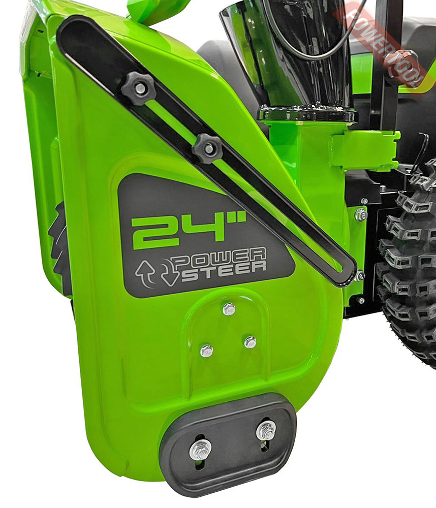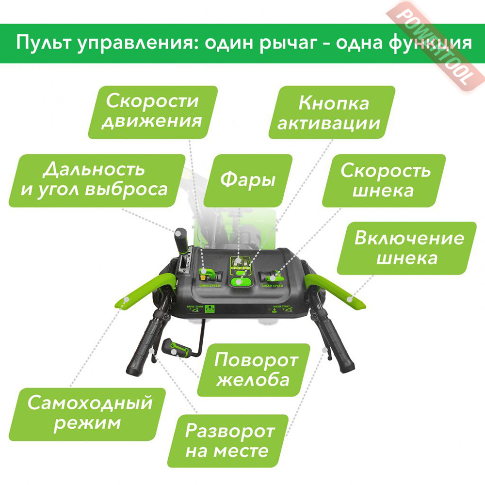 - Снегоуборщик самоходный (3 скорости вперед и одна назад, нейтраль). Снегоуборщик оснащен системой разворота на месте Zero Turn. В отличии от бензинового инструмента, где используется один двигатель как для вращения крыльчатки, так и для движения, у снегоуборщика Greenworks целых три электродвигателя! Основной двигатель вращает шнек через ременную передачу и редуктор. Каждый из двух двигателей движения встроен в колесо. При развороте на месте колеса вращаются в разные стороны. Фрикциона, подверженного износу и, или другой коробки передач просто нет, поэтому система исключительно надежна.