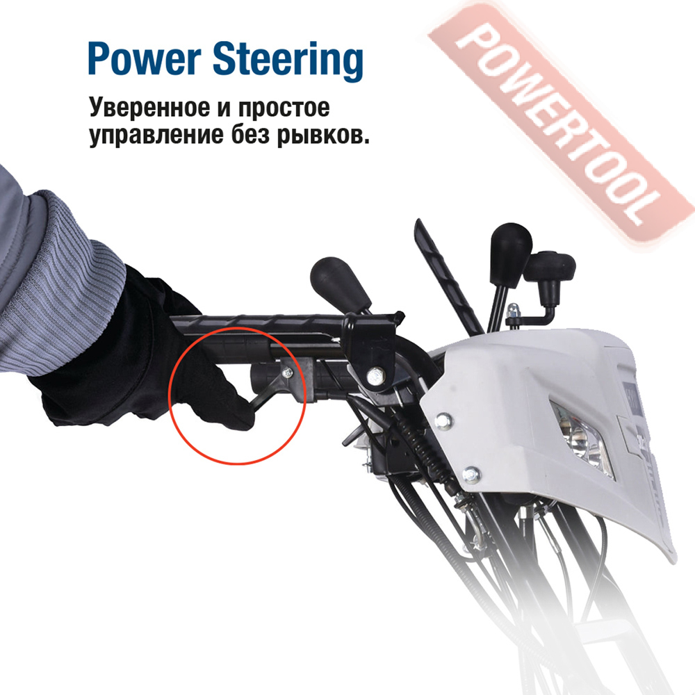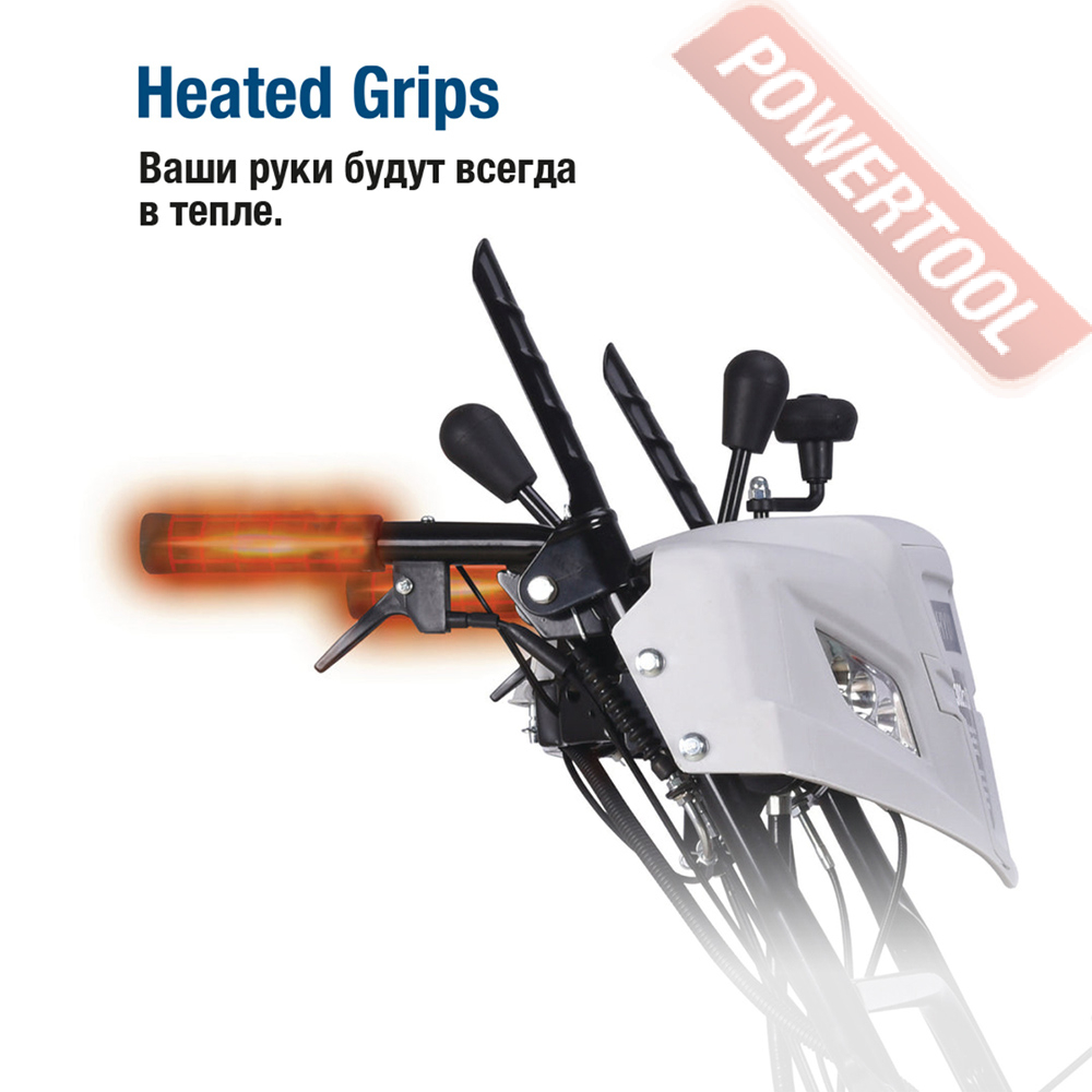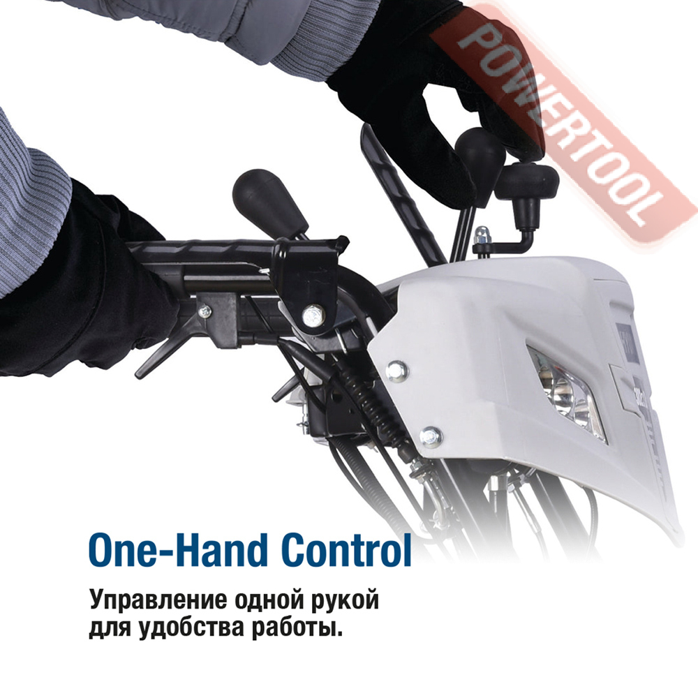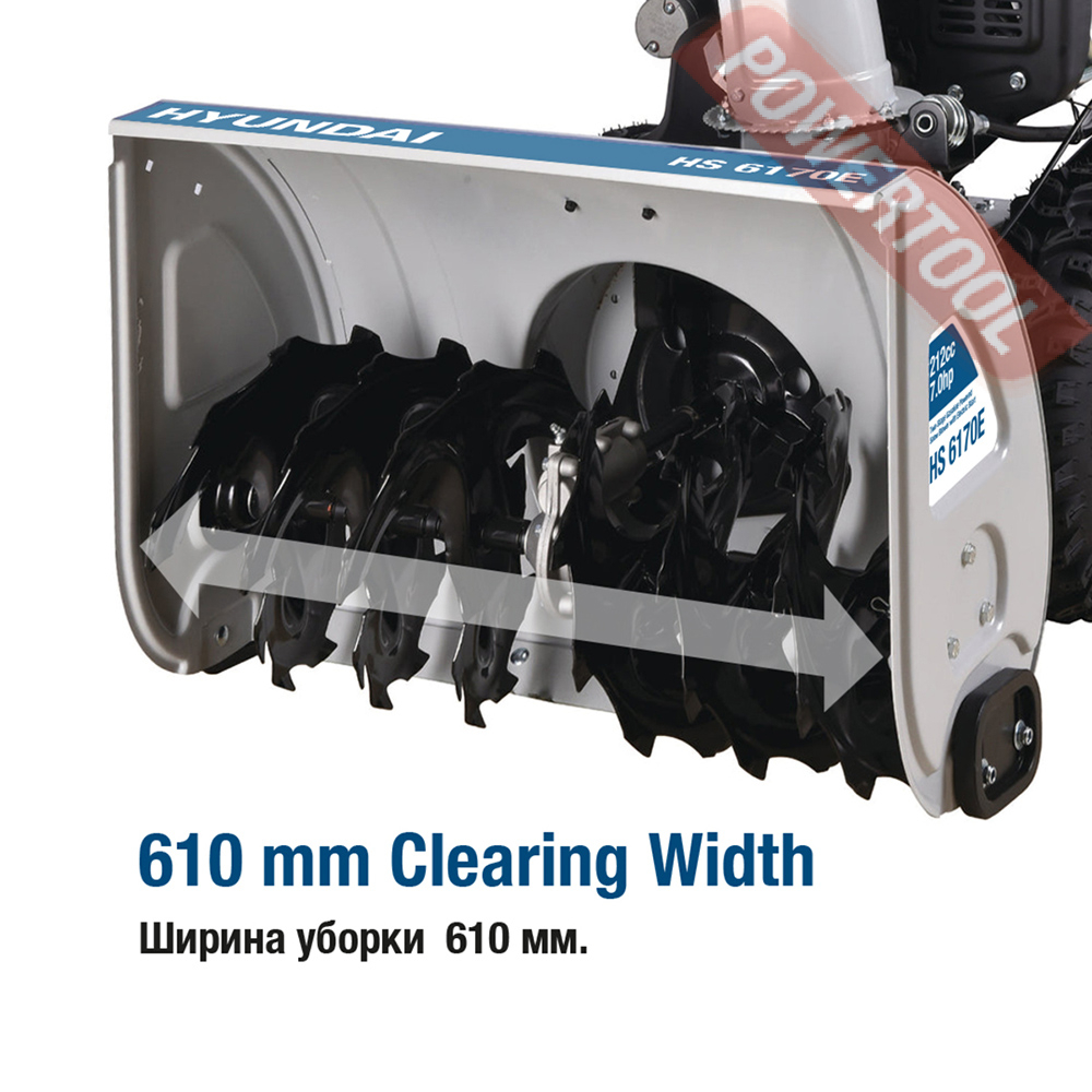 Снегоуборщик колесный самоходный, ширина ковша 61 см, высота ковша 51 см, скорости 6 вперед и 2 назад, выбор направления и дальности выброса снега рукоятками с панели оператора, дальность выброса достигает до 15 м, разблокировка дифференциала курками под каждой рукояткой, управление одной рукой, подогрев рукояток, две LED фары, пневматические колеса 35,5х12,7 см, 4-тактный бензиновый двигатель HYUNDAUI ICW210 объемом 196 куб.см и мощностью 7 л.с., электростартер от сети 220 В, топливный бак 2,5 л, объем картера 0,6 л, трансмиссия фрикционный диск, вес 80 кг.