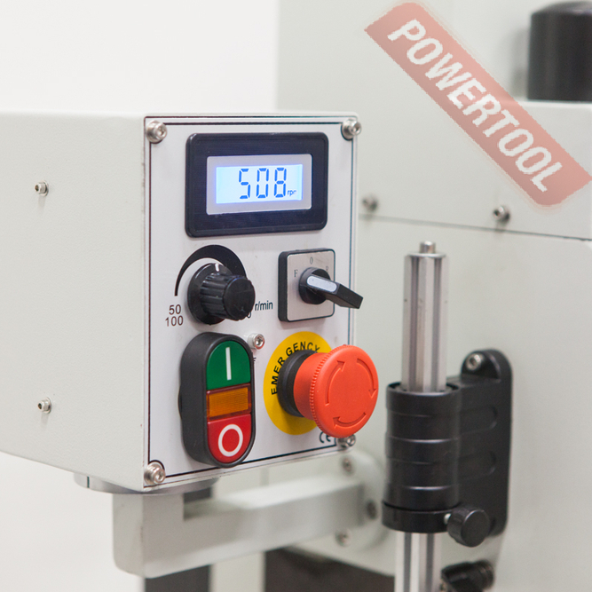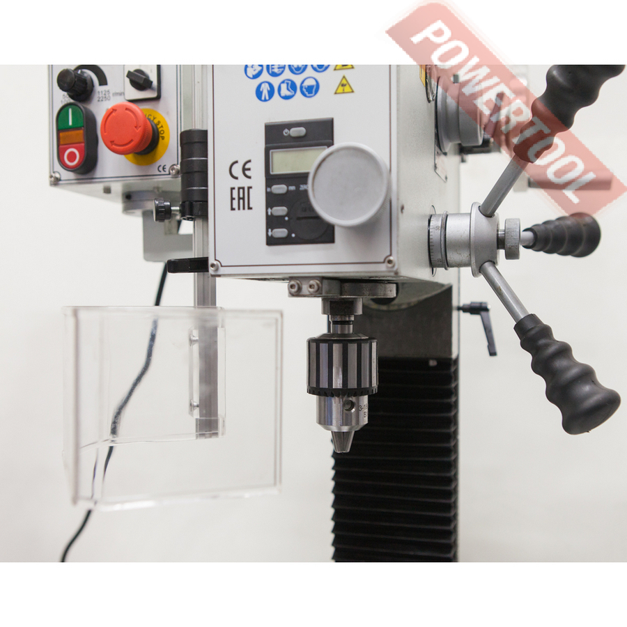 Фрезерно-сверлильный станок, 750 Вт, 220 В, max диаметр сверления 20 мм, max нарезаемая резьба M10, max диаметр концевой фрезы 20 мм, max диаметр торцевой фрезы 63 мм, частота вращения шпинделя 50-2250 об/мин, бесступенчатая регулировка оборотов, индикация числа оборотов, конус шпинделя КМ-2, посадочное сверлильного патрона B16, диапазон хвостовиков для патрона 1-13 мм, ход пиноли шпинделя 50 мм, вылет шпинделя 170 мм, шпиндель-стол 370 мм, перемещение головки по оси Z 275 мм, наклон головки влево/вправо 90/90 градусов, размер стола ДхШ 180х500 мм, ход стола по оси XхY 305х150 мм, 3 Т-образных паза 12 мм, габариты ДхШхВ 600х584х780 мм, вес 110 кг, в комплекте патрон B16 1-13 мм, оправка КМ-2/B16, зажимная тяга М12, защитный экран, набор инструментов.