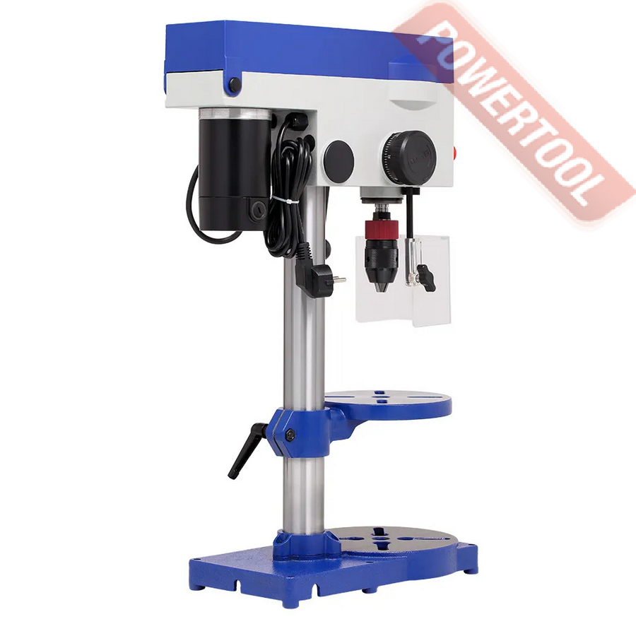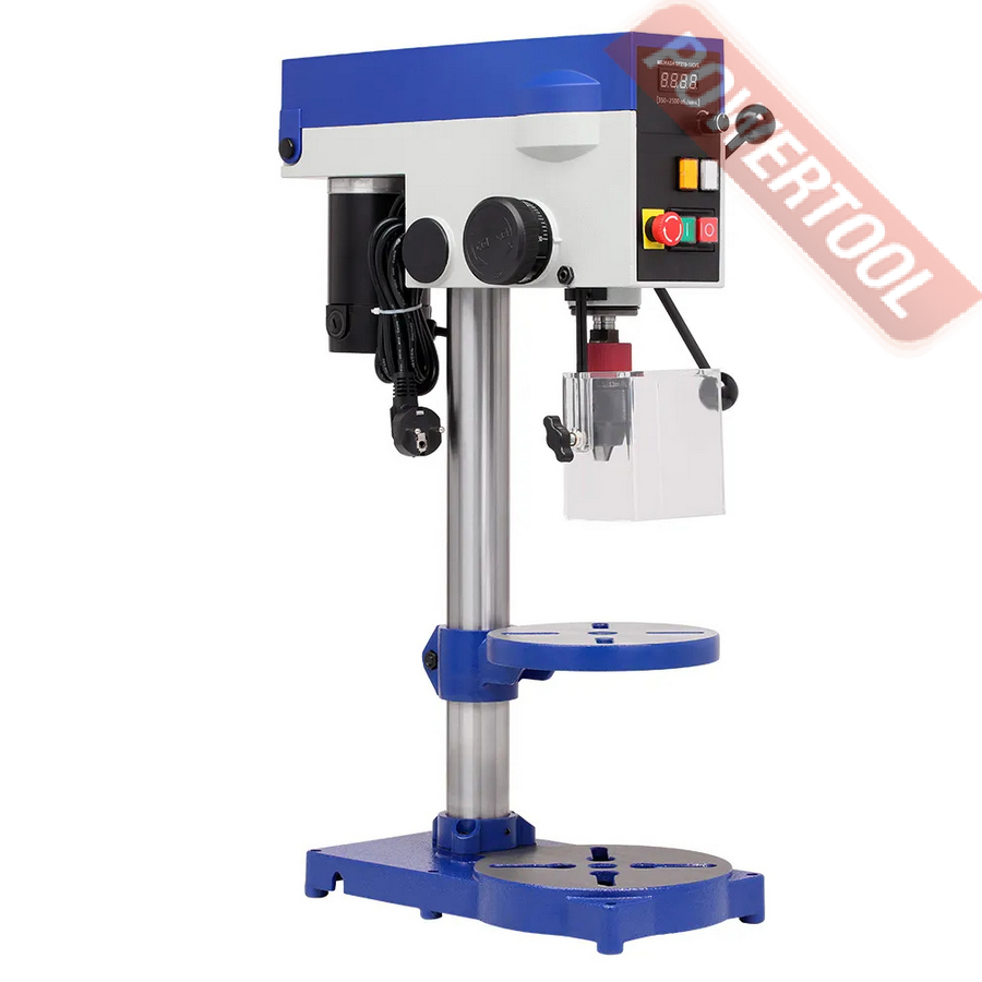 Сверлильный станок, 350 Вт, 220 В, max диаметр сверления 13 мм, частота вращения шпинделя 350-2500 об/мин, бесступенчатая регулировка оборотов, индикация числа оборотов, посадочное сверлильного патрона B16, диапазон хвостовиков для патрона 1-13 мм, ход пиноли шпинделя 50 мм, вылет шпинделя 105 мм, шпиндель-стол 270 мм, шпиндель-основание 350 мм, диаметр стойки 48 мм, размер основания 330х190 мм, размер стола 170 мм, 4 Т-образных паза, подсветка рабочей зоны, лазерный целеуказатель, габариты ДхШхВ 380х210х645 мм, вес 12,5 кг, в комплекте патрон быстрозажимной В16 1-13 мм, защитный экран, набор инструментов.