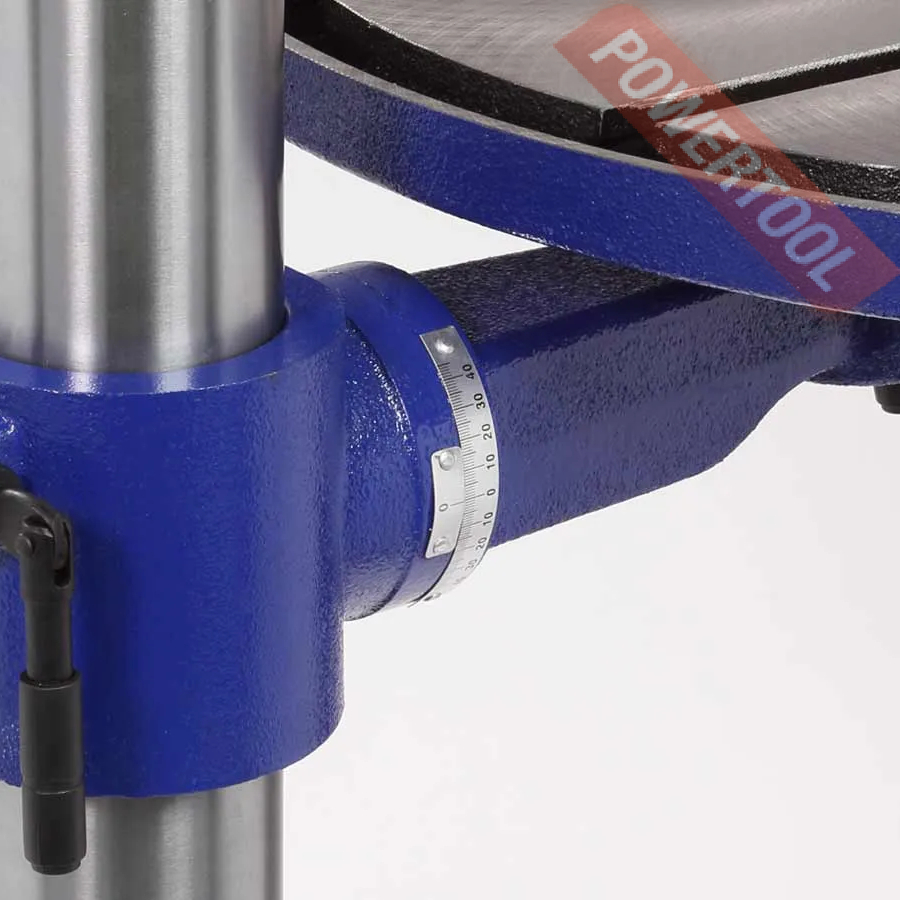 Заготовку можно крепить как к рабочему столу, так и к основанию, все зависит от ее размера. В комплекте предусмотрены тиски. Для их крепления есть два Т-образных паза на рабочем столе и два паза на основании. Основание станка массивное, что обеспечивает устойчивость, хотя для дополнительной фиксации есть четыре отверстия. Для точного позиционирования режущего инструмента станок оснащен лазером-указателем. Кроме него работу облегчит подсветка рабочей зоны. Ход пиноли составляет 80 мм. Наконечники тройной рукояти удобной формы, что способствует плавной подаче сверла к заготовке.