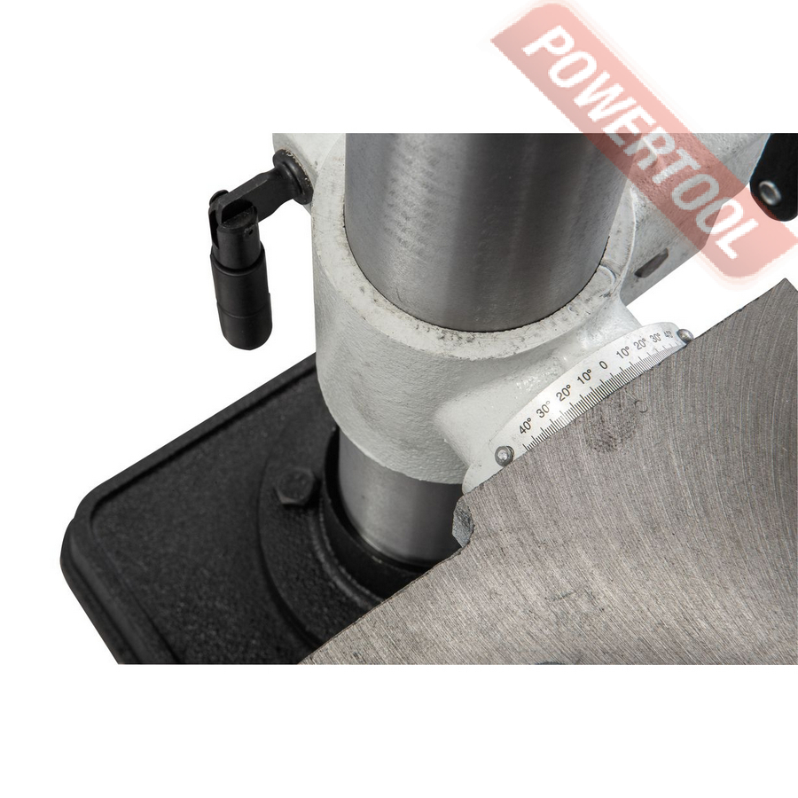 Рукоятка привода пиноли оборудована лимбом для контроля подачи и имеет встроенный ограничитель хода (глубины сверления). В штатный комплект поставки входят быстрозажимной патрон и станочные тиски Wilton, для крепления которых предусмотрены пазы на столе и на опорном основании станка.