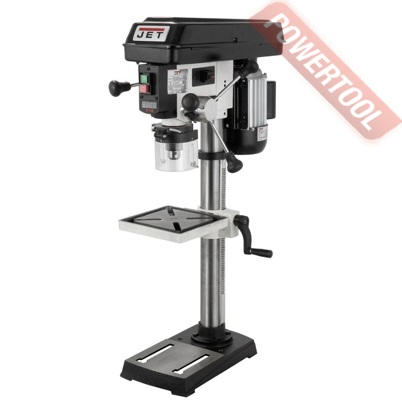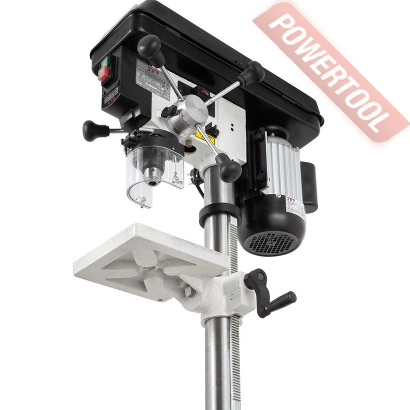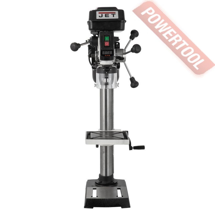 Сверлильный станок по дереву JET JWDP-10 с вариатором для работы в небольших мастерских с деревом, металлом и другими материалами. Его конструкция базируется на узлах и деталях профессиональной модели JWDP-12, но имеет ряд отличий: уменьшены общие размеры, изменено устройство стола, использован ключевой патрон и т.п. Эти меры позволили снизить стоимость при сохранении основных достоинств: частота вращения шпинделя меняется простым перемещением рычага управления, установленная скорость отображается на цифровом дисплее, штатная комплектация включает в себя лазерный указатель оси сверления, рабочий стол имеет Т-образные пазы для крепления тисков и прихватов, предусмотрена работа от основания.