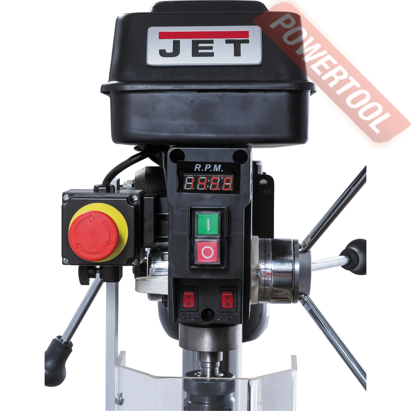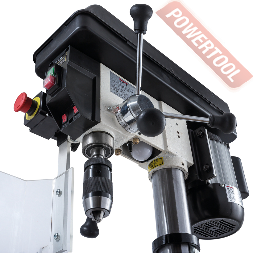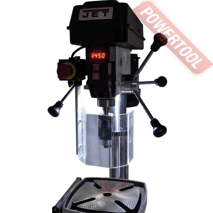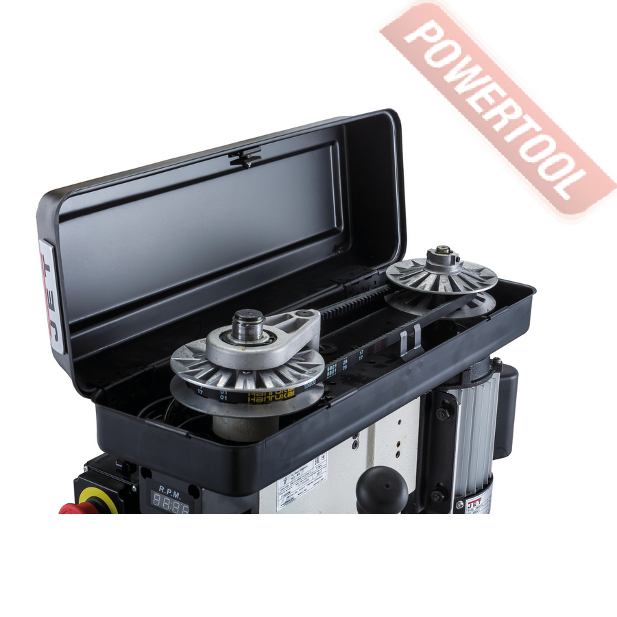 Сверлильный станок по дереву JET JWDP-12 подходящий для универсального (дерево и металл) применения. Основная отличительная черта этой модели – клиноременный вариатор, позволяющий плавно бесступенчато изменять скорость вращения шпинделя. Такая конструкция механизма ускоряет настройку в зависимости от диаметра сверления: вместо снятия и последующей установки ремня достаточно перевести рычаг, причем делают это, не выключая мотор. При этом фактическая скорость вращения шпинделя будет отображаться на цифровом дисплее, что особенно важно при работе с металлом, когда ограничения по частоте вращения режущего инструмента гораздо более строгие, чем при работе с деревом.