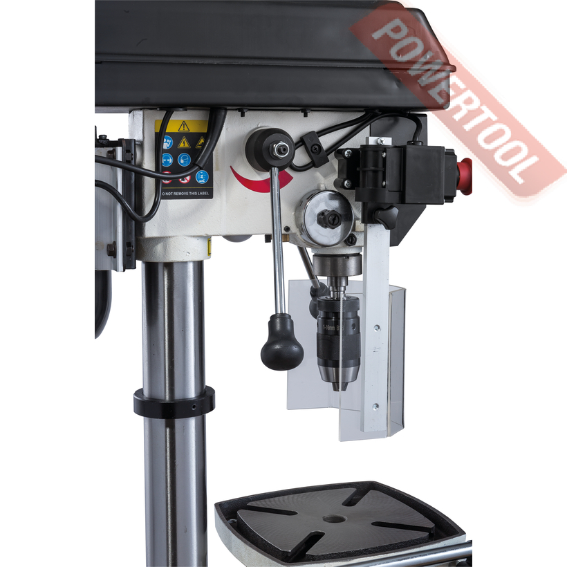 Подача пиноли производится стандартным штурвалом с тремя рукоятками, на его оси лимб для контроля глубины сверления. Кроме того. есть винтовой ограничитель с собственной миллиметровой шкалой, облегчающей настройку положения гайки-стопора. Вес подвижной части (шпиндель, быстрозажимной патрон, режущий инструмент) частично компенсируется спиральной пружиной, у которой можно менять предварительный натяг. Предусмотрен светодиодный фонарик с выключателем для подсветки рабочей области и лазерный указатель оси сверления.