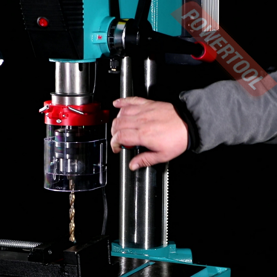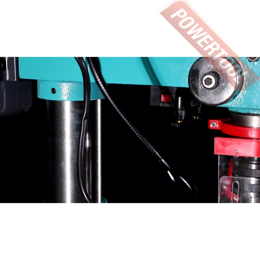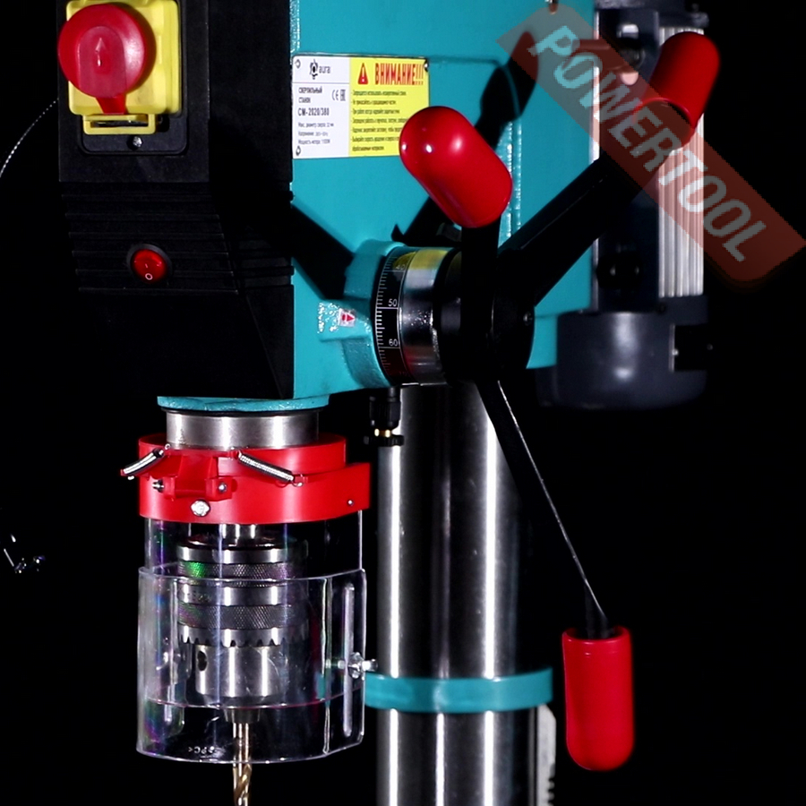 Сверлильный станок, 1100 Вт, 380 В, max диаметр сверления 32 мм, частота вращения шпинделя 150-2450 об/мин, 16 передач, ступенчатая регулировка оборотов, конус шпинделя КМ-4, посадочное сверлильного патрона B22, диапазон хвостовиков для патрона 5-20 мм, ход пиноли шпинделя 120 мм, вылет шпинделя 255 мм, шпиндель-стол 745 мм, шпиндель-основание 1205 мм, диаметр колонны 92 мм, размер основания 560х460 мм, размер стола 420х480 мм, наклон стола влево/вправо 45/45 градусов, угол поворота стола 360 градусов, 2 Т-образных паза, подсветка рабочей зоны, лазерный целеуказатель, габариты ДхШхВ 800х470х1710 мм, вес 125 кг, в комплекте патрон ключевой В22 5-20 мм, оправка КМ-4/В22, защитный экран, набор инструментов, тиски.